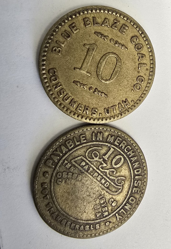 / 2 Brass Tokens — Blue Blaze Coal Co. — Consumers, Utah — Payable in Merchandise Only
