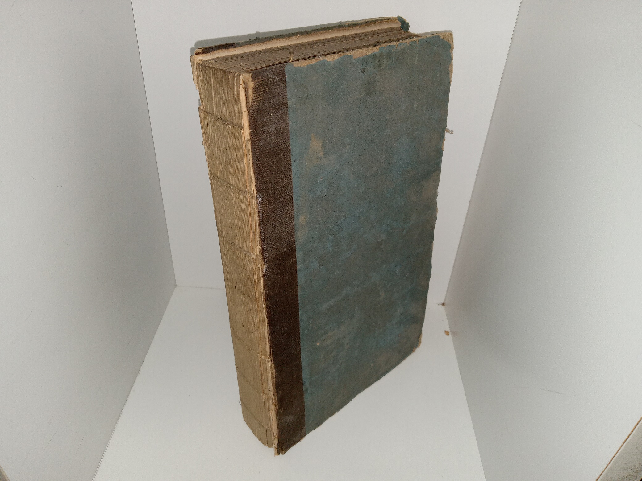 Fair condition hardcover with no dust jacket, and with the spine torn off. The cover has stains, wrinkling, tears, pieces torn off, and bent corners. The front board has been detached from the binding. Some pages have stains, wrinkling, or creases. The front inside cover has a sticker. Some of the pages are bound upside down. The title page has writing in pencil.