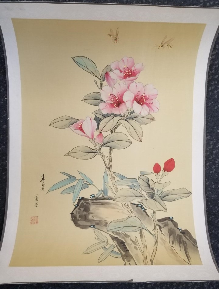 Unique Oriental Water Color — About 20″ x 14″ — Hand Painted on Silk — Flower With Wasps