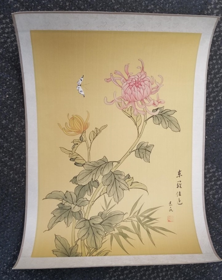 Unique Oriental Print — About 20″ x 14″ — Hand Painted on Silk — Flower/White Butterfly quantity