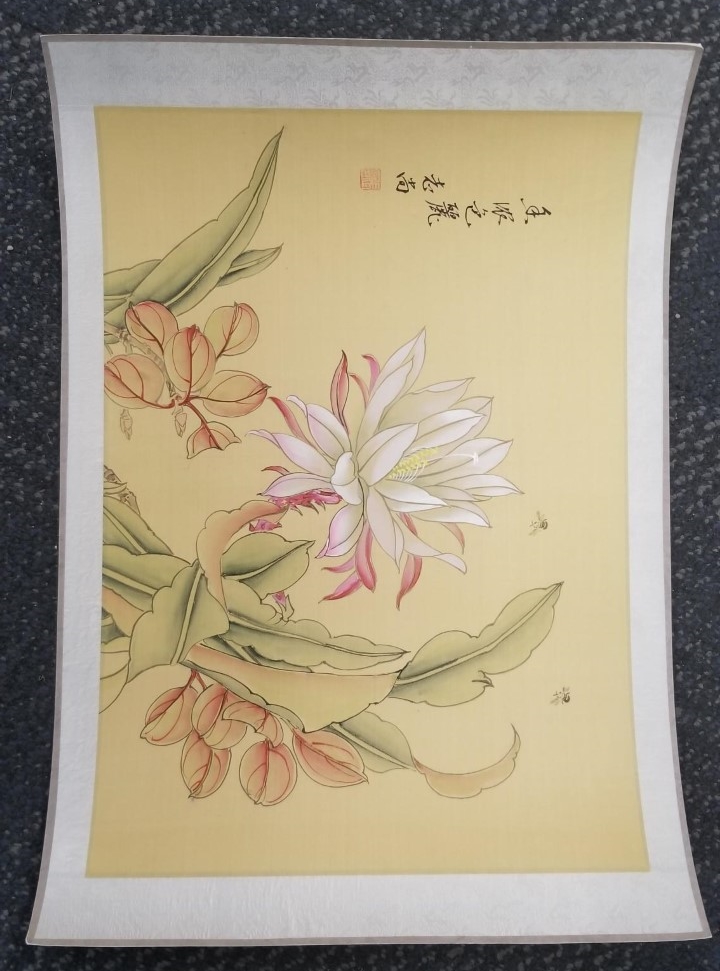 Unique Oriental Print — About 20″ x 14″ — Hand Painted on Silk — Flowers and Bees quantity