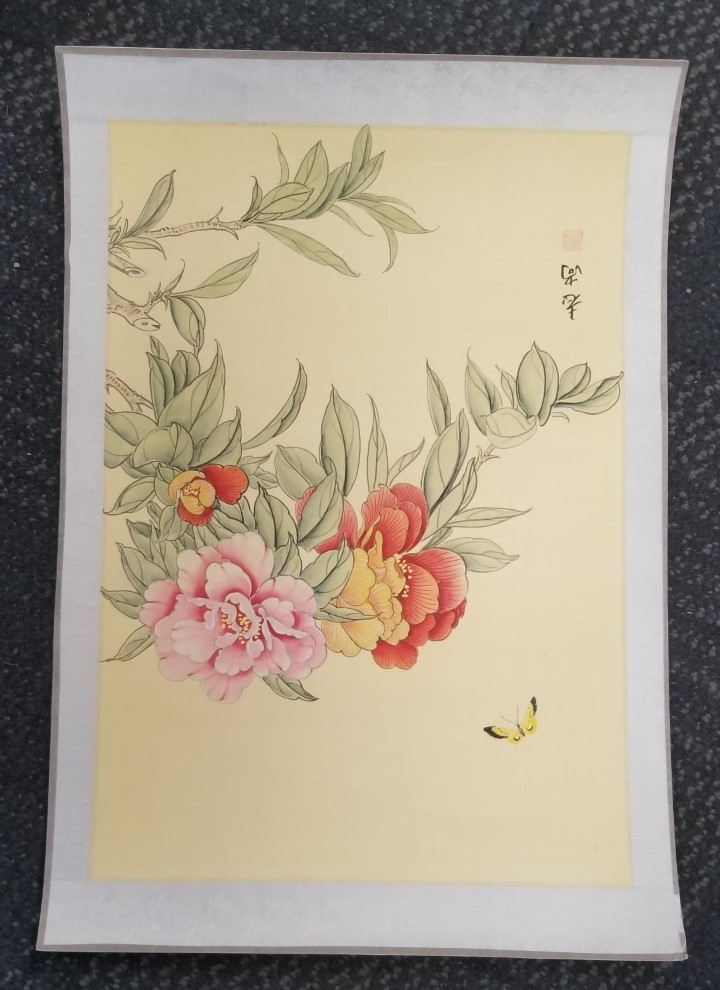 Unique Oriental Print — About 20″ x 14″ — Hand Painted on Silk — Flowers and Butterfly