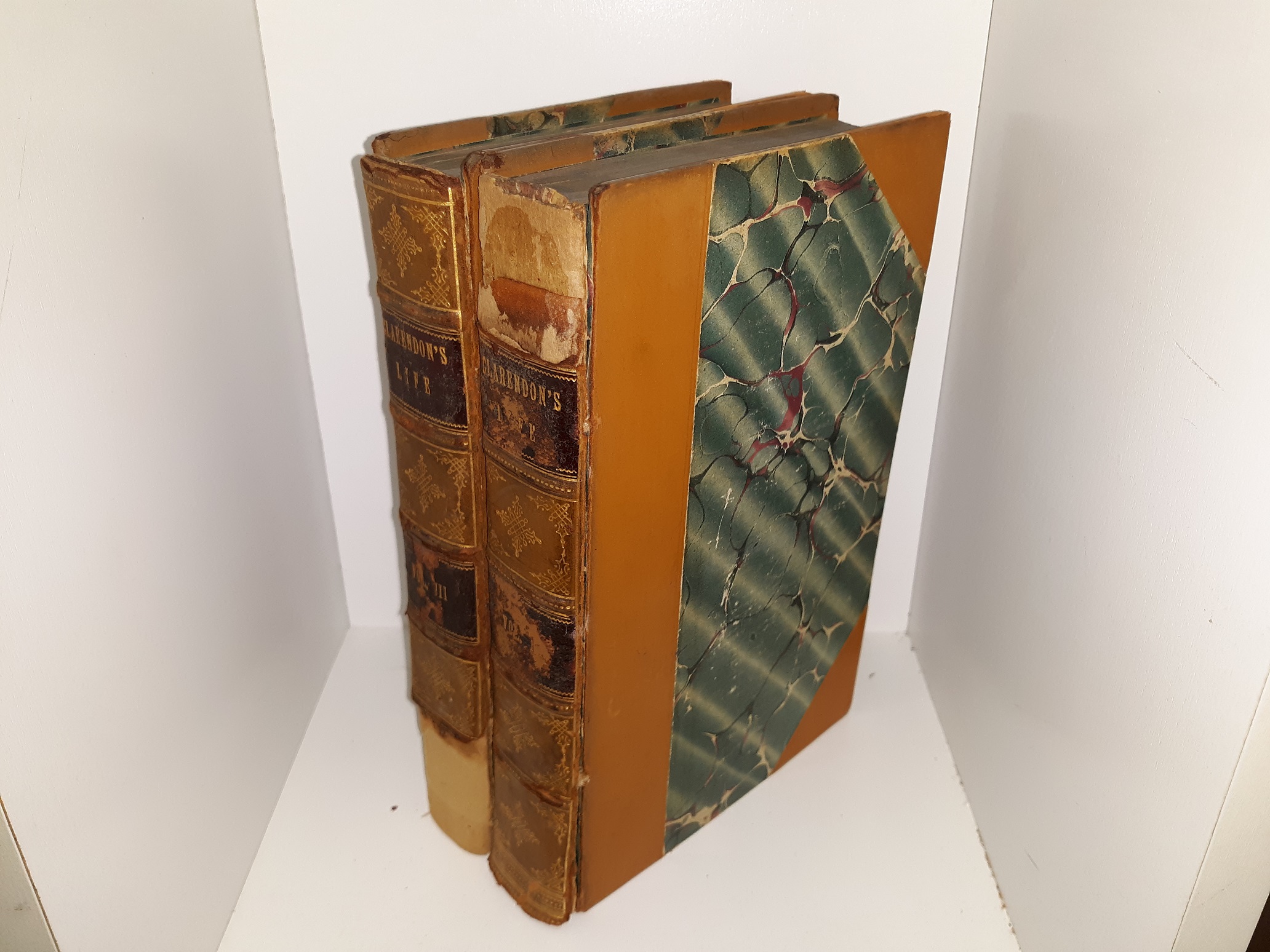 2 fair condition, brown, 3/4 leather, hardcovers with no dust jackets. The spines have large pieces torn off, and tears on the edges. The covers have scuffing, fading, some tears and fraying at the edges and corners. The binding of both books is torn and partially loose. The second flyleaves and title pages have some writing in pencil and eraser marks. Text throughout each book is clean, clear, and legible.