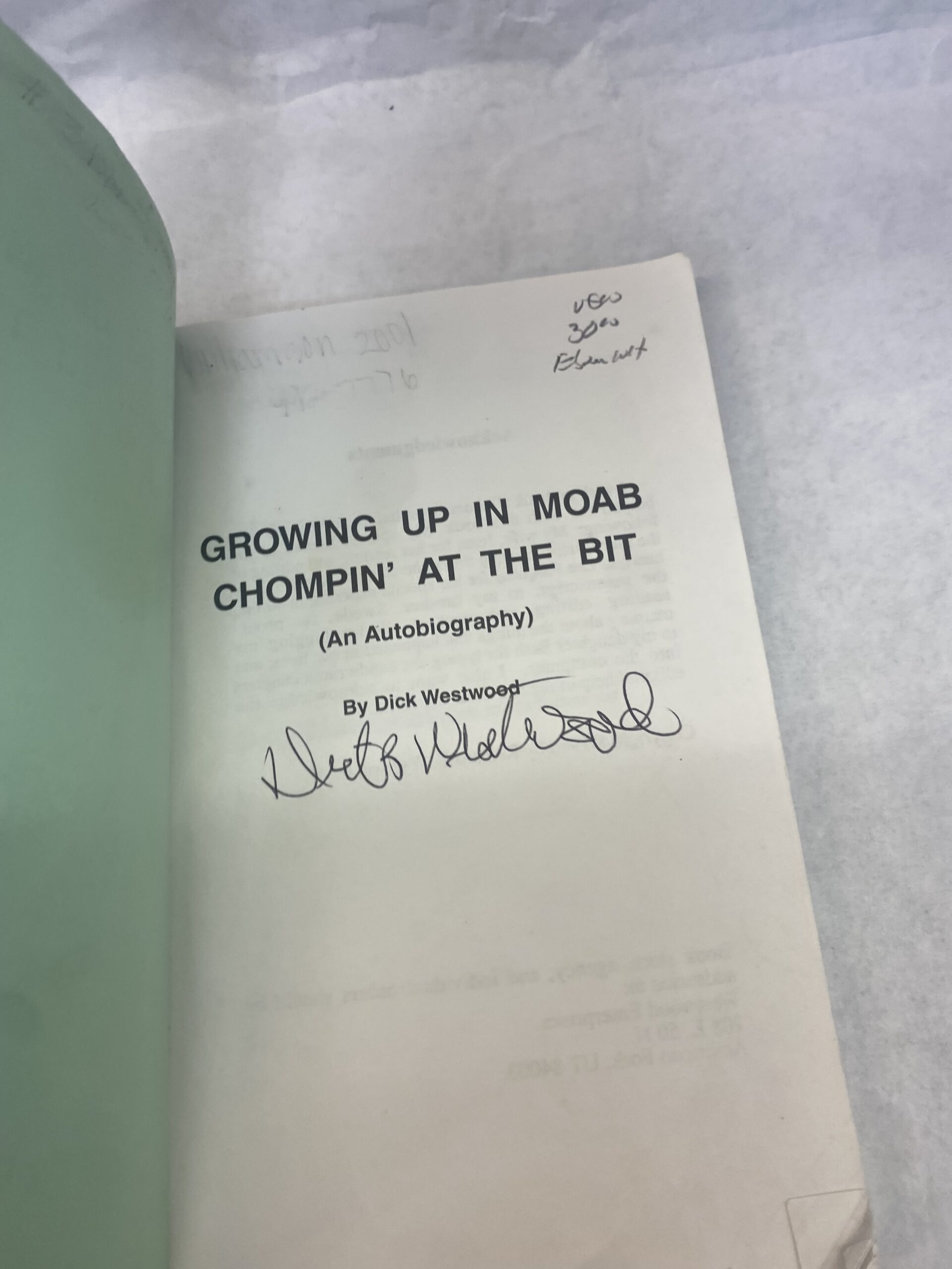 Signed copy of Growing Up in Moab Chompin’ at the Bit by Dick Westwood. Paperback, 1986.