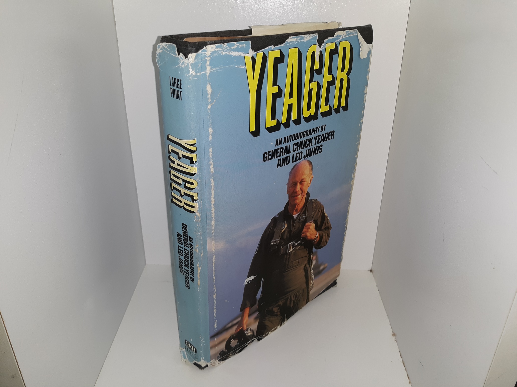 Good condition, light blue hardcover with a fair condition dust jacket. The dust jacket has pieces torn off, heavy scuffing, some fading, tears, some stains, and large scratches. The front inside cover has a note card tape to it with some writing on it. The front flyleaf has a signature from one of the authors (Chuck Yeager)! The edges of some pages have minor stains. Text and illustrations throughout are clean, clear, and legible.