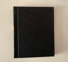 This is a black hardbound and is in good condition. There is a sticker on the spine that is faded. There is some damage on the top and bottom of the spine. The edges of the page have some tears. A couple of the pages have some pen markings.