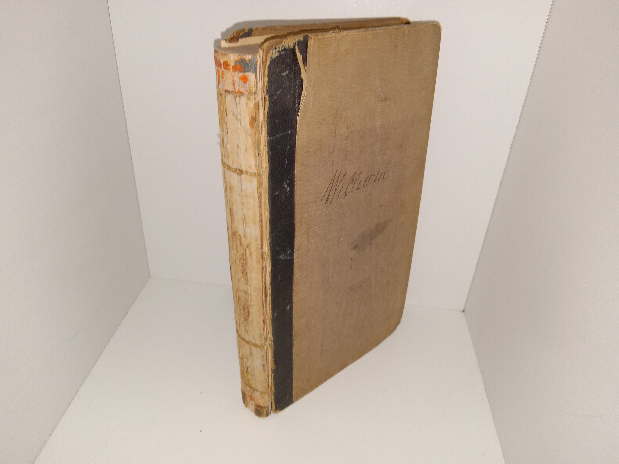 Fair condition hardcover with the spine torn off, and no dust jacket. The front cover is completely detached, and the back cover is mostly detached. The covers have stains, scuffing, fading, tears, pieces torn off, peeling, and fraying, with bent corners. Some pages are detached from the binding. The pages have stains, wrinkling, small tears, small pieces torn off, and some creasing. The front inside cover has a sticker, and writing in pencil. The front flyleaf has streaks of whiteout. The second flyleaf has writing in pencil and eraser marks.