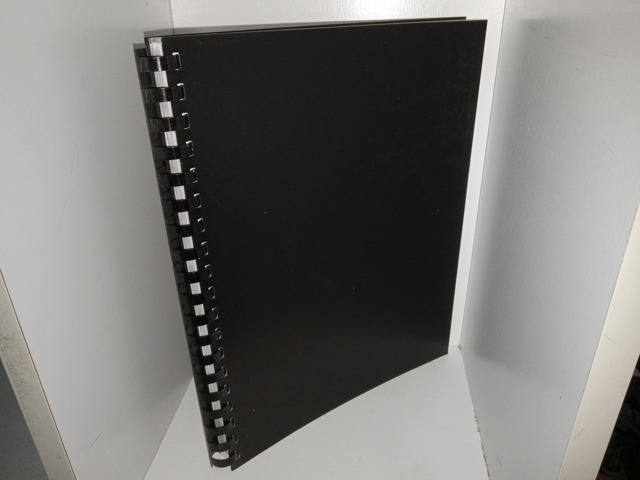 Good condition, large, black softcover with no title printed on the covers, and with a black comb binding. The cover has some scuff marks. The title page has writing in pencil and eraser marks. Text throughout is clean, clear, and legible.