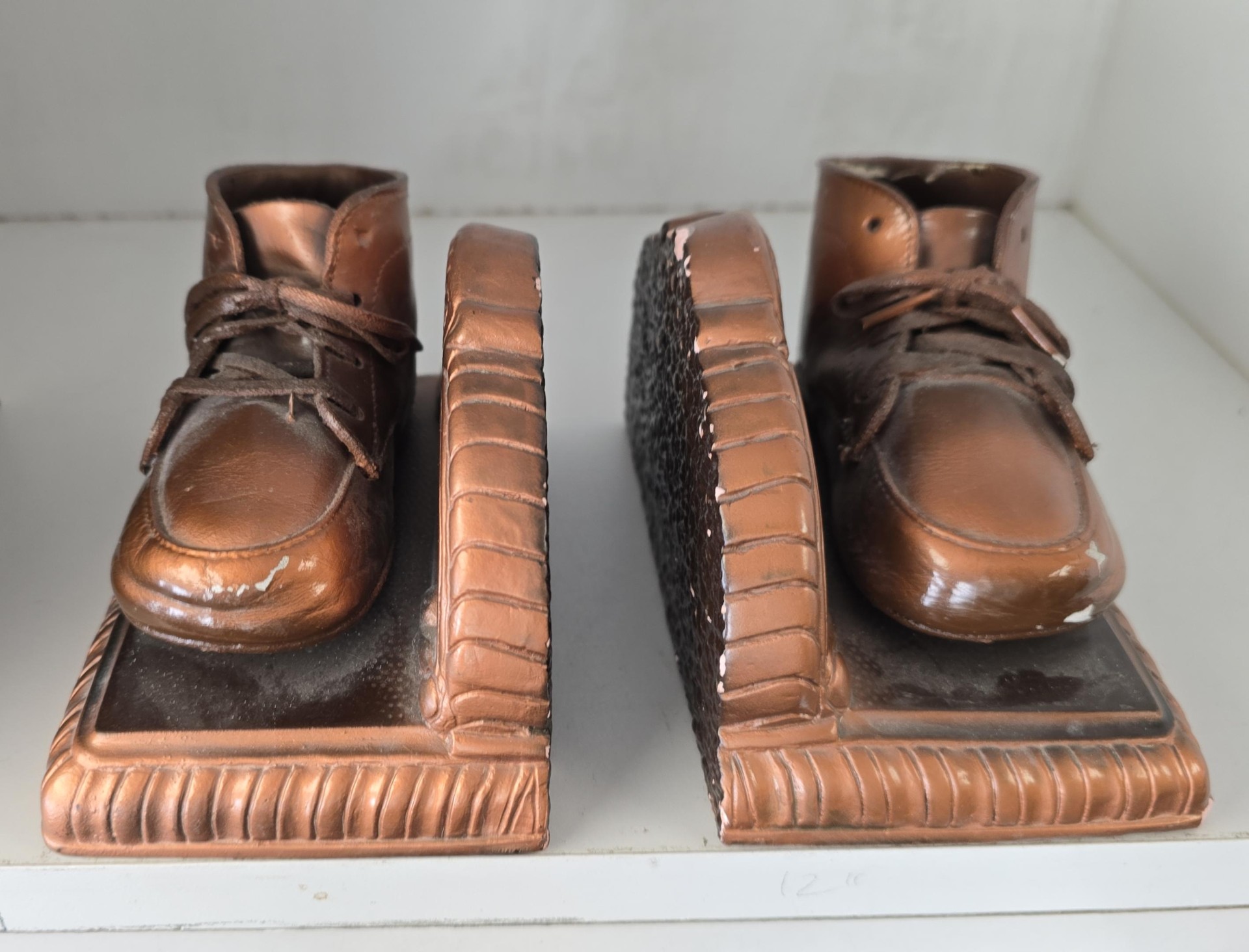 These book ends have slight chipping but are quite unique; it appears that whoever made them used actual baby shoes and had them painted.