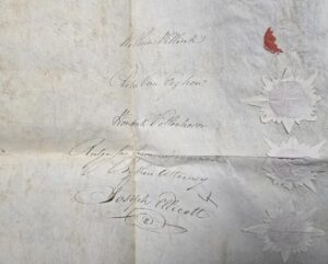 The document is also signed by Joseph Ellicott, a famous “American surveyor, city planner, land office agent, lawyer and politician of the Quaker faith.” (See Wikipedia). He was famous for laying out the city of Buffalo, New York. We just aren’t sure about the other signatures.