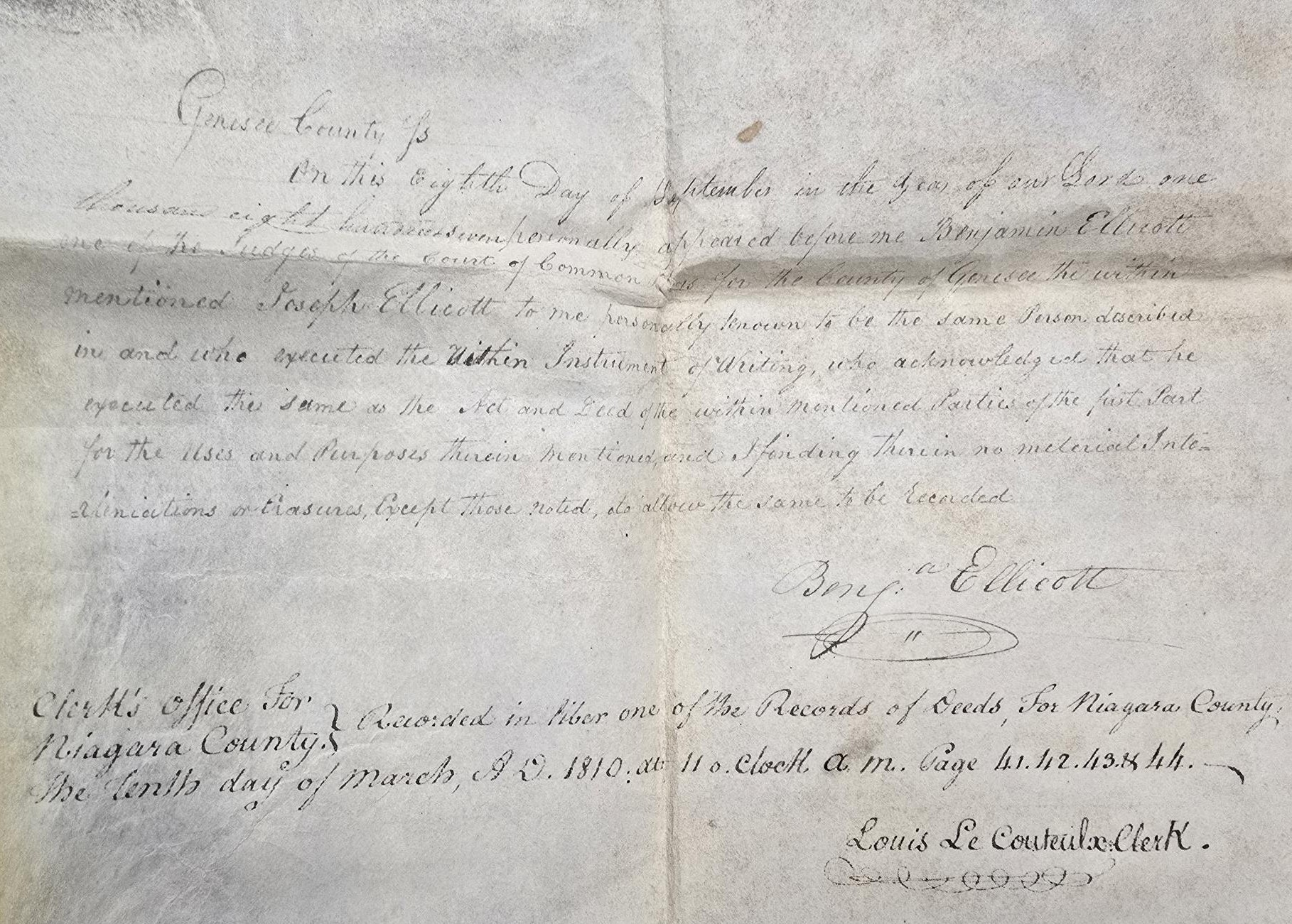 The document is also signed by Joseph Ellicott, a famous “American surveyor, city planner, land office agent, lawyer and politician of the Quaker faith.” (See Wikipedia). He was famous for laying out the city of Buffalo, New York. We just aren’t sure about the other signatures.