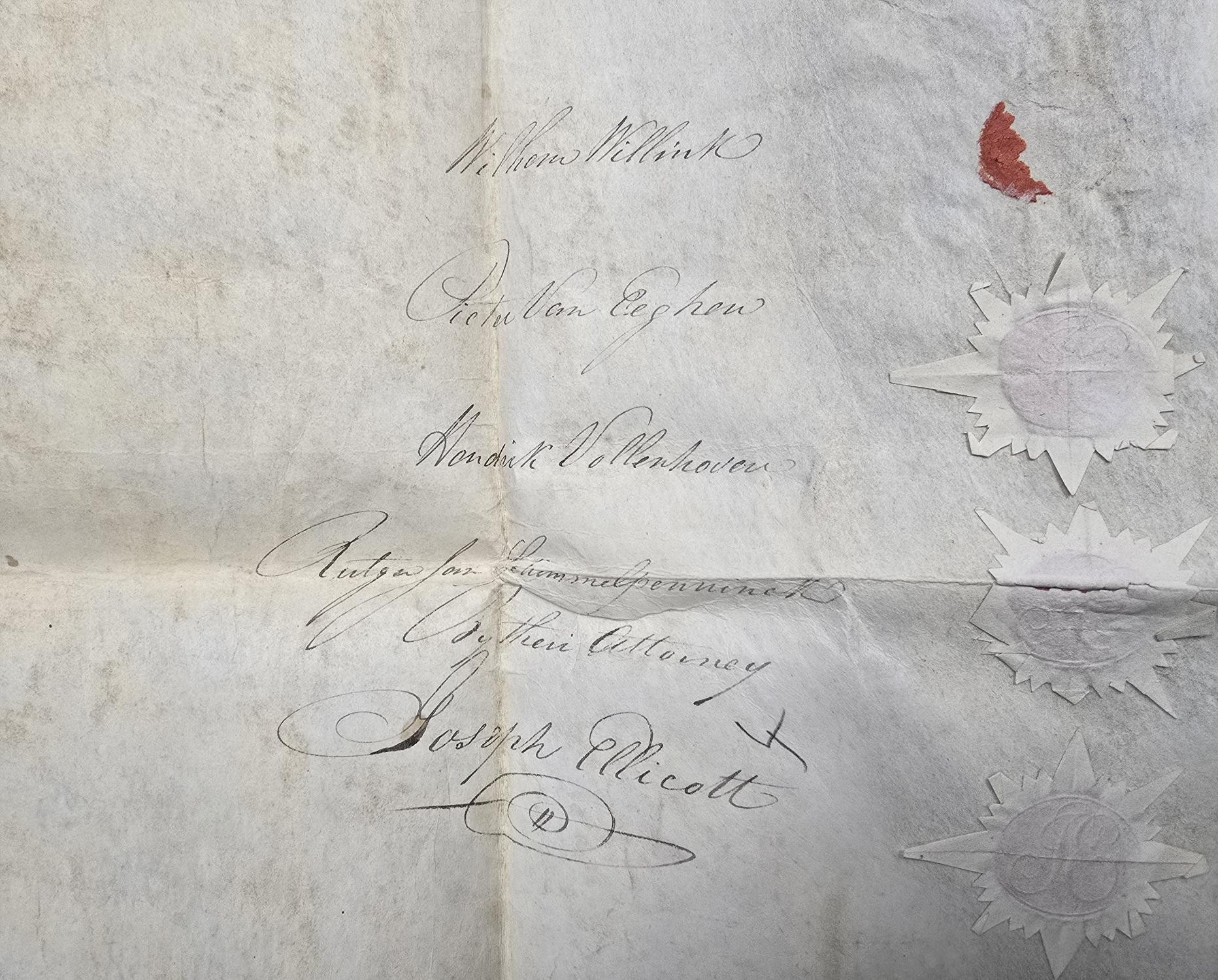 One signature on the document is Wilhelm Willink. He was a Dutch businessman who was “a wealthy Amsterdam merchant, and one of the investors in the Holland Land Company.” (See Wikipedia).