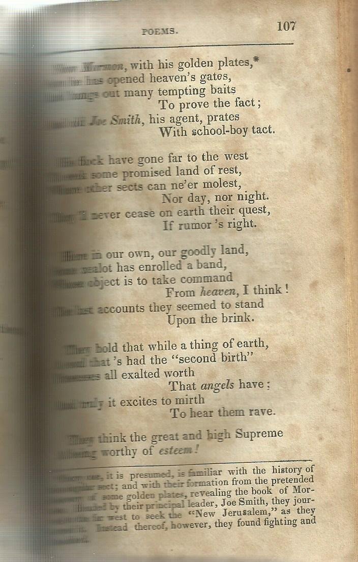 Page107 has one of the earliest brief mentions of Joseph Smith, the Book of Mormon, and the Mormons! First of five verses reads: “Now Mormon, with his golden plates, Says he has opened heaven’s gates, And hangs out many tempting baits To Prove the fact; And old Joe Smith, his agent, prates With school-boy tact.”