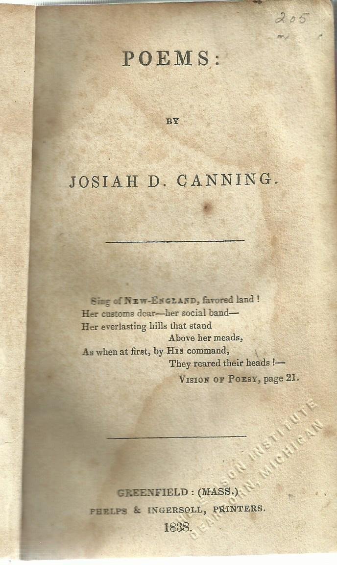 1838. Poems: By Josiah D. Canning. Phelps & Ingersoll, Printers. Greenfield: Mass., 1838. 205p. Leather spine; marbled boards; worn corners; boards present but both detached.
