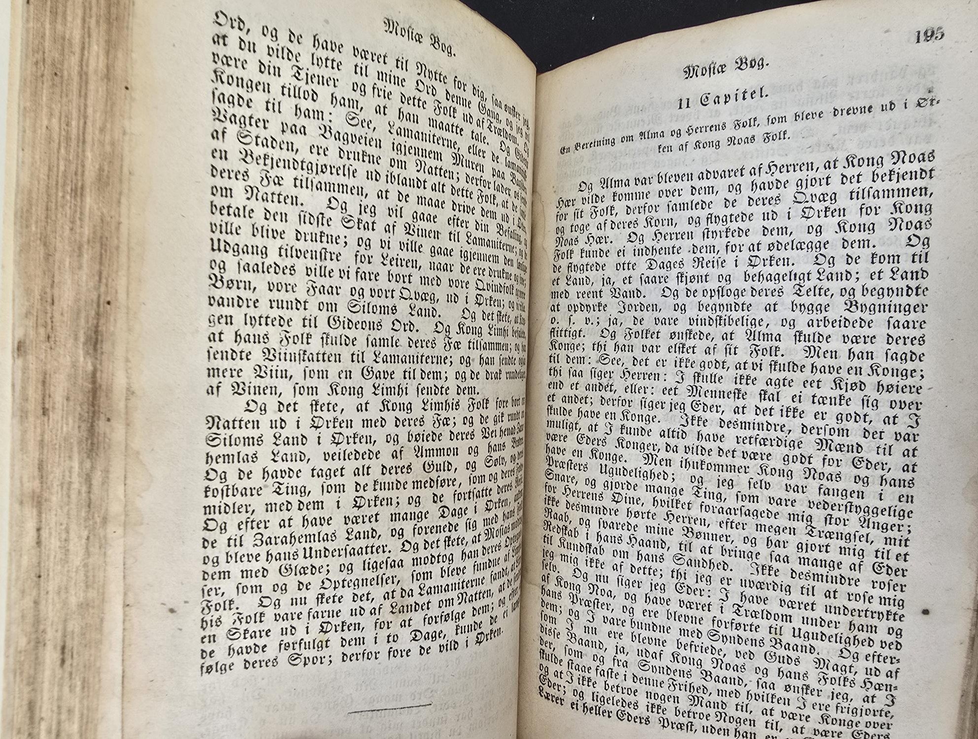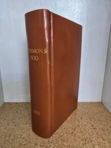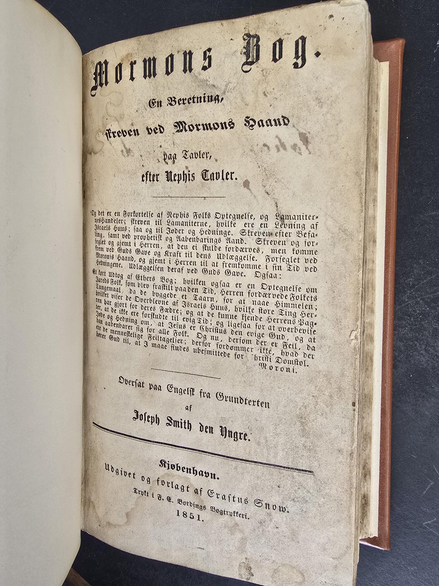 This is a first edition Book of Mormon, in Danish, printed in 1851, but it has been rebound into a more modern binding. It’s actually a quite soft brown leather with the title and date printed on the spine.