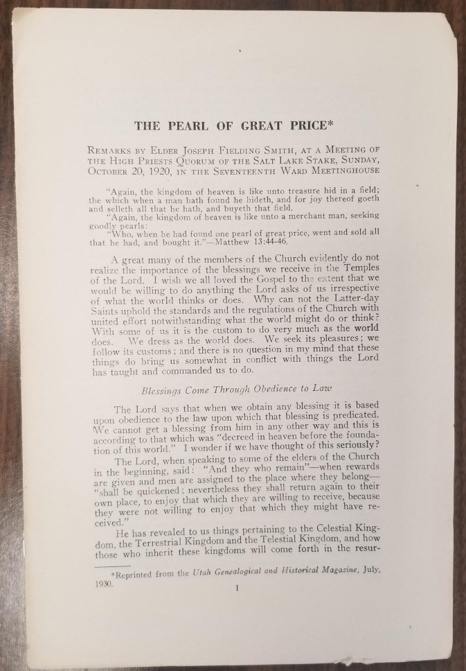 1930 — The Pearl of Great Price – Remarks by Elder Joseph Fielding Smith, at a Meeting of the High Priests Quorum of the Salt Lake Stake, Sunday October 20, 1920, in the Seventeenth Ward Meetinghouse — Rare 8-Page Pamphlet