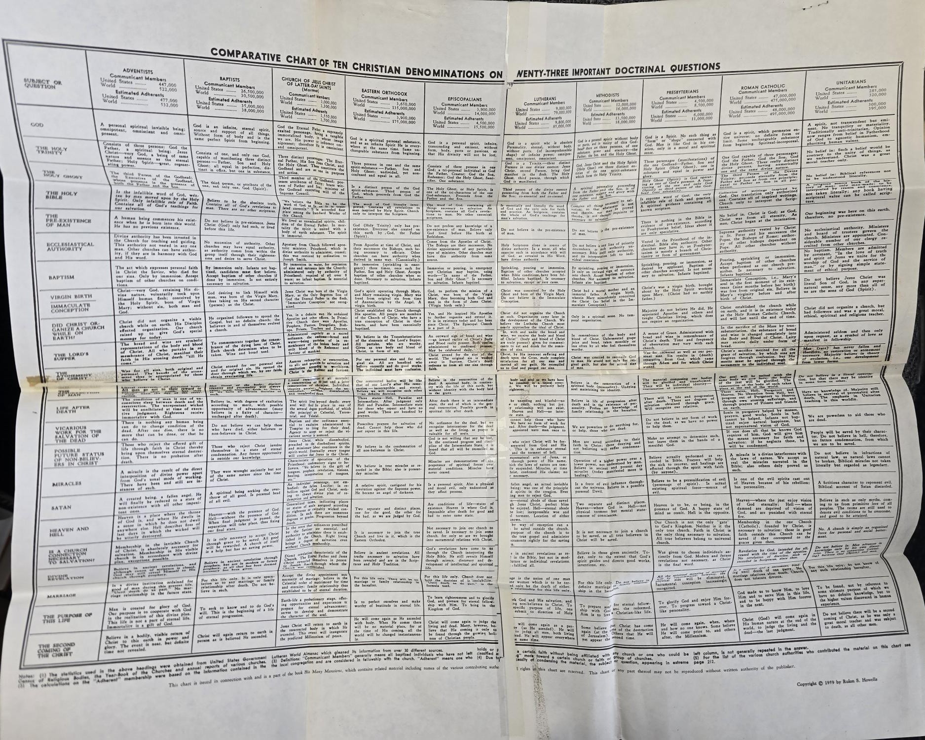 1959 -- Comparative Chart of Ten Christian Denominations on Twenty-Three Important Doctrinal Questions --- Chart quantity