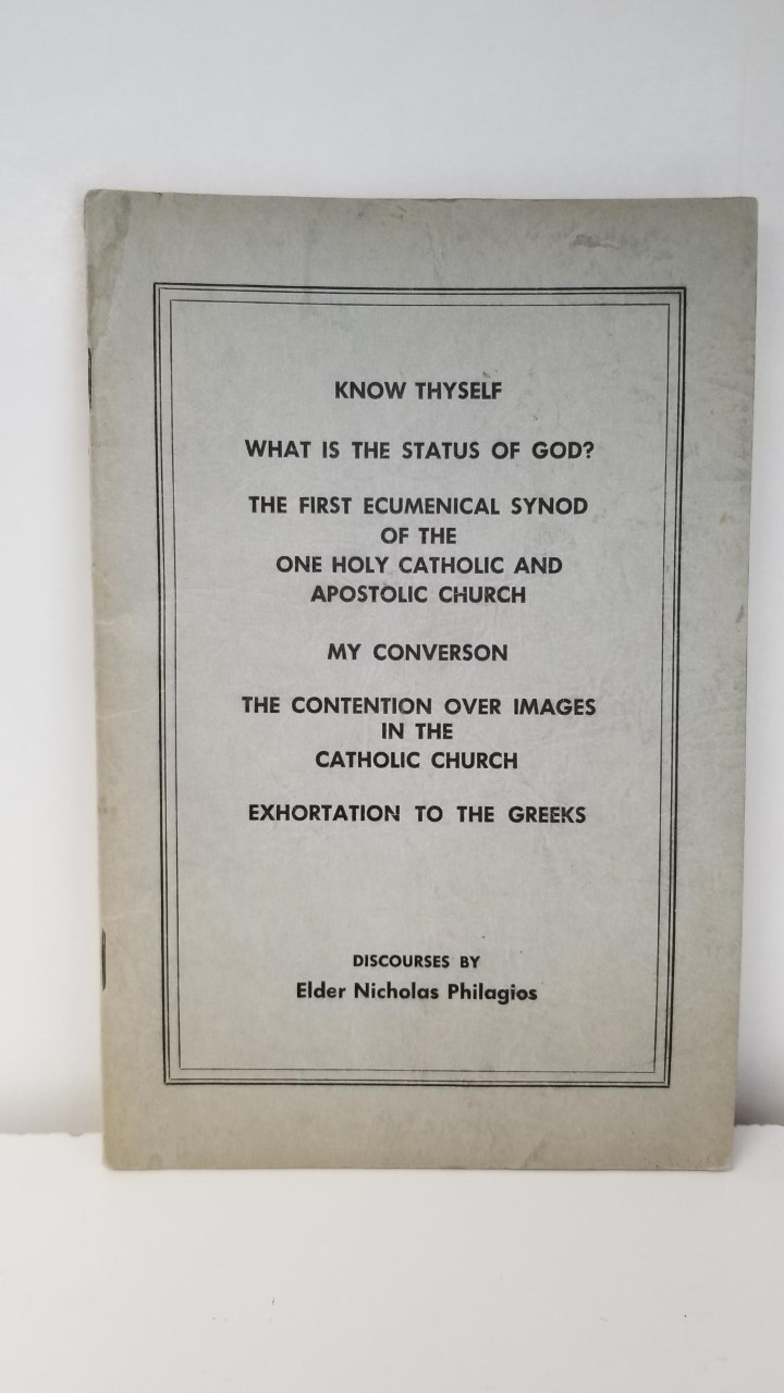 Philagios, Nicholas. Know Thyself. What Is The Status of God? The First Ecumenical Synod of The One Holy Catholic and Apostolic Church. My Conversion. The Contention Over Images in the Catholic Church. Exhortation to the Greeks. Deseret News Press, 1961. 62p. Softbound.