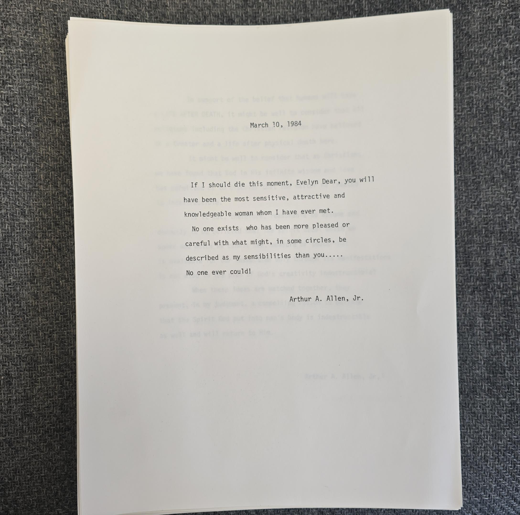 Many of the papers end with the name Arthur A. Allen Jr. and on the top page he says that “Evelyn Dear” is the “most sensitive, attractive and knowledgeable woman whom I have ever met.”
