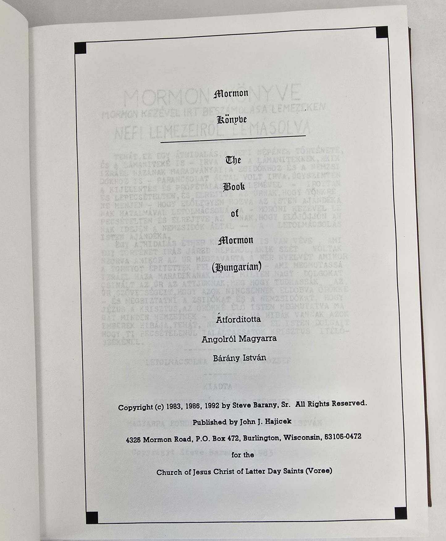 1992 — The Book of Mormon (Hungarian) Atforditotta Angolrol Magyarra Barany Istvan — Church of Jesus Christ of Latter-day Saints (Voree)
