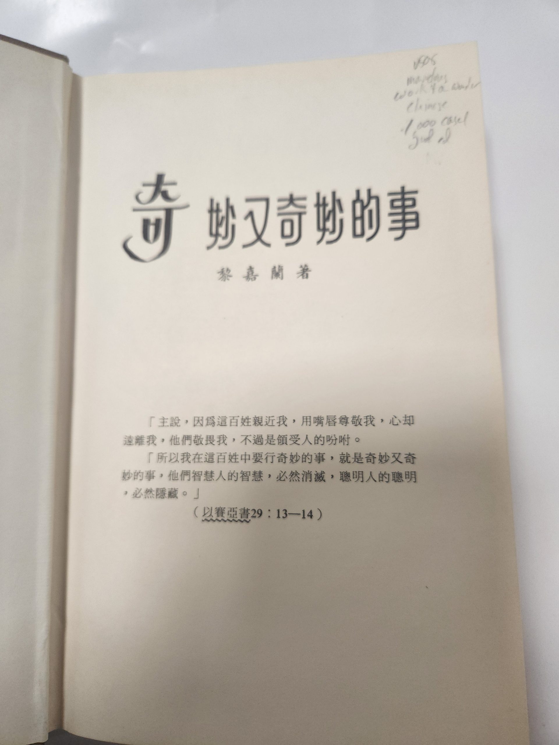 A Marvelous Work and a Wonder by LeGrand Richards (Chinese Translation, 2nd printing-1969, hardcover + dust jacket). Jacket has moderate small tears along the edges, fading color and several scratches/dings. No markings. Cover slightly bent. LDS Case 1, light blue w/ gold Chinese figures.