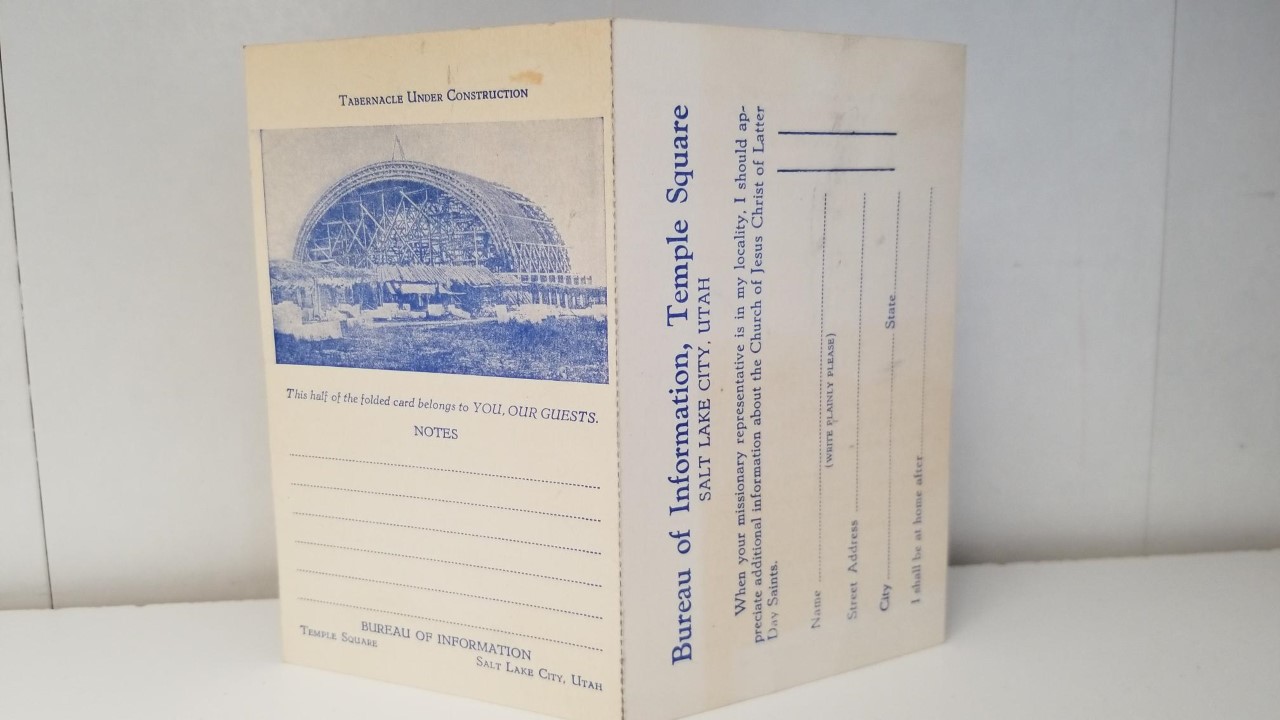 Bureau of Information Temple Square — Guest Card — “Tabernacle Under Construction” — [For Guests to Fill Out and Keep Half]
