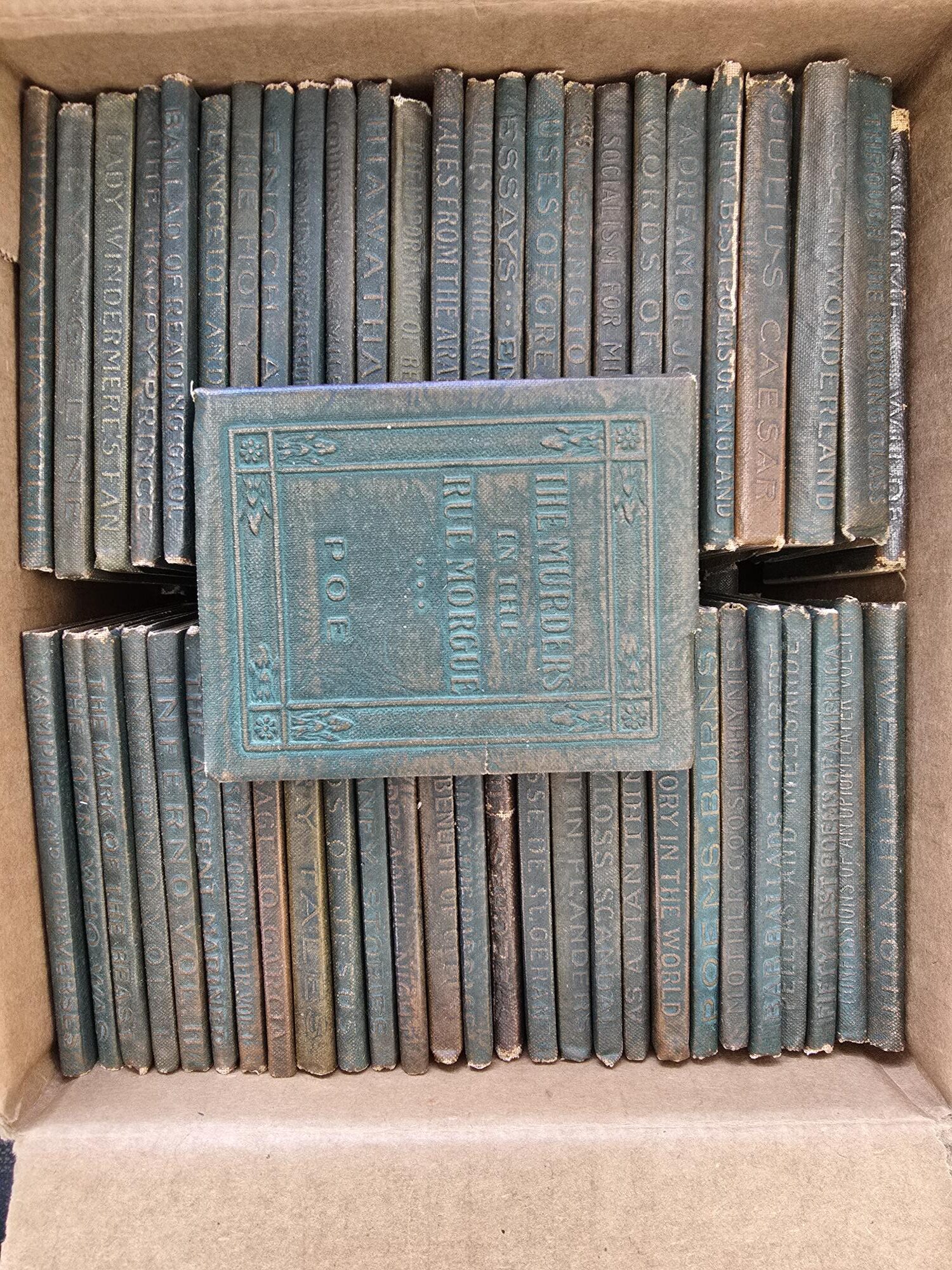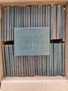 We have exactly 100 of them in this box; we counted them! But we did not check to see if there were duplicates, nor are we going to take the time to list all the titles. If you are familiar with the series you’ll know what kind of books are included; i.e. shakespeare, emerson, etc…. YOU CAN CLICK ON THE PHOTOS BELOW TO ENLARGE THEM.