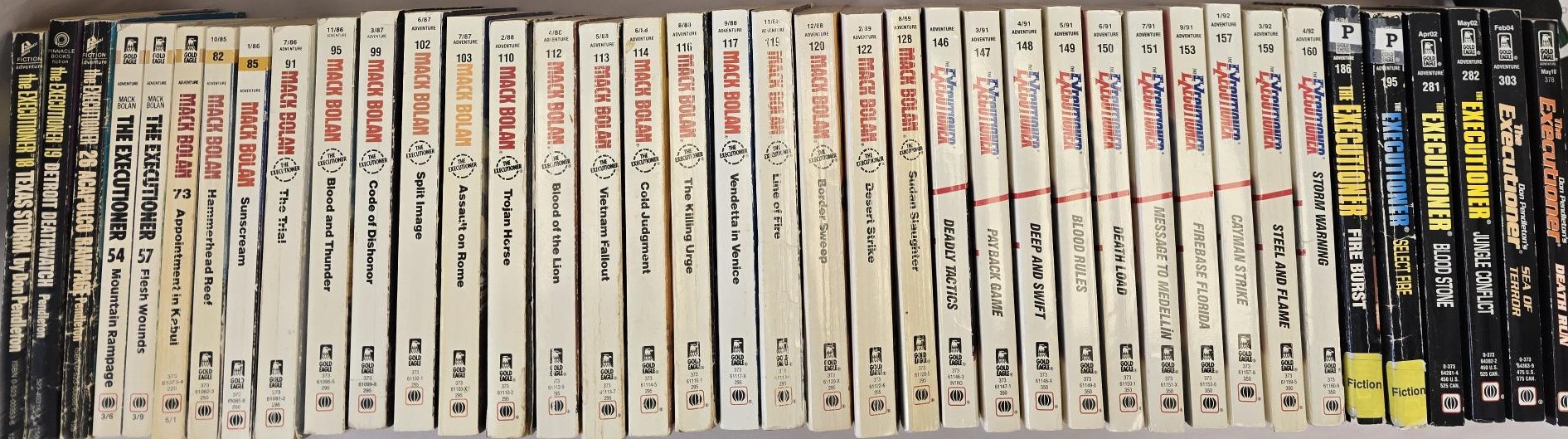 Paperback partial set from the series THE EXECUTIONER. All these books are in good to very good used condition. NO FOREIGN ORDER ON THIS LOT, as it will already cost us more to ship than our website charges.