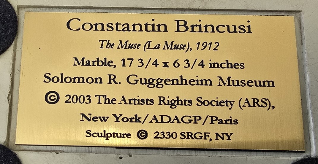 Constantin Brincusi — The Muse (La Muse), 1912 — Marble 17.75 ” x 6.75″ — 2003 Reproduction in Marble — Artists Rights Society / Solomon R. Guggenheim Museum — New York