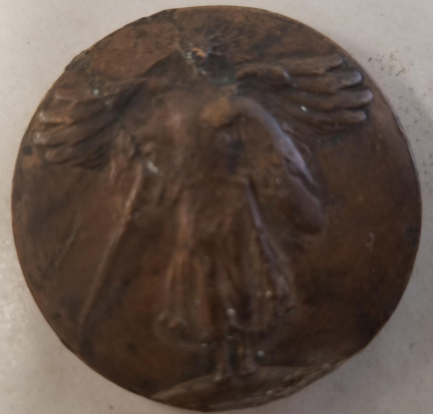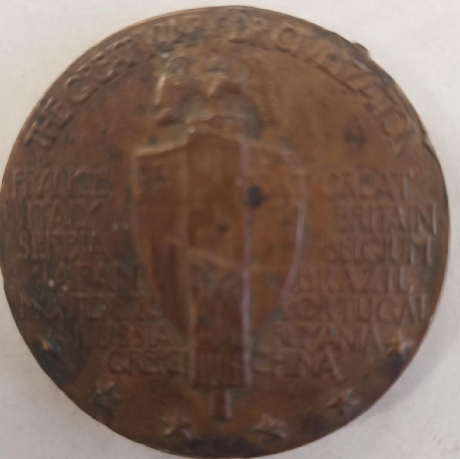 This coin, we believe to be copper, and it lists all those countries on one side. On the other side is a woman with wings and a sword. No date. Pretty Good Condition, but perhaps a bit worn.