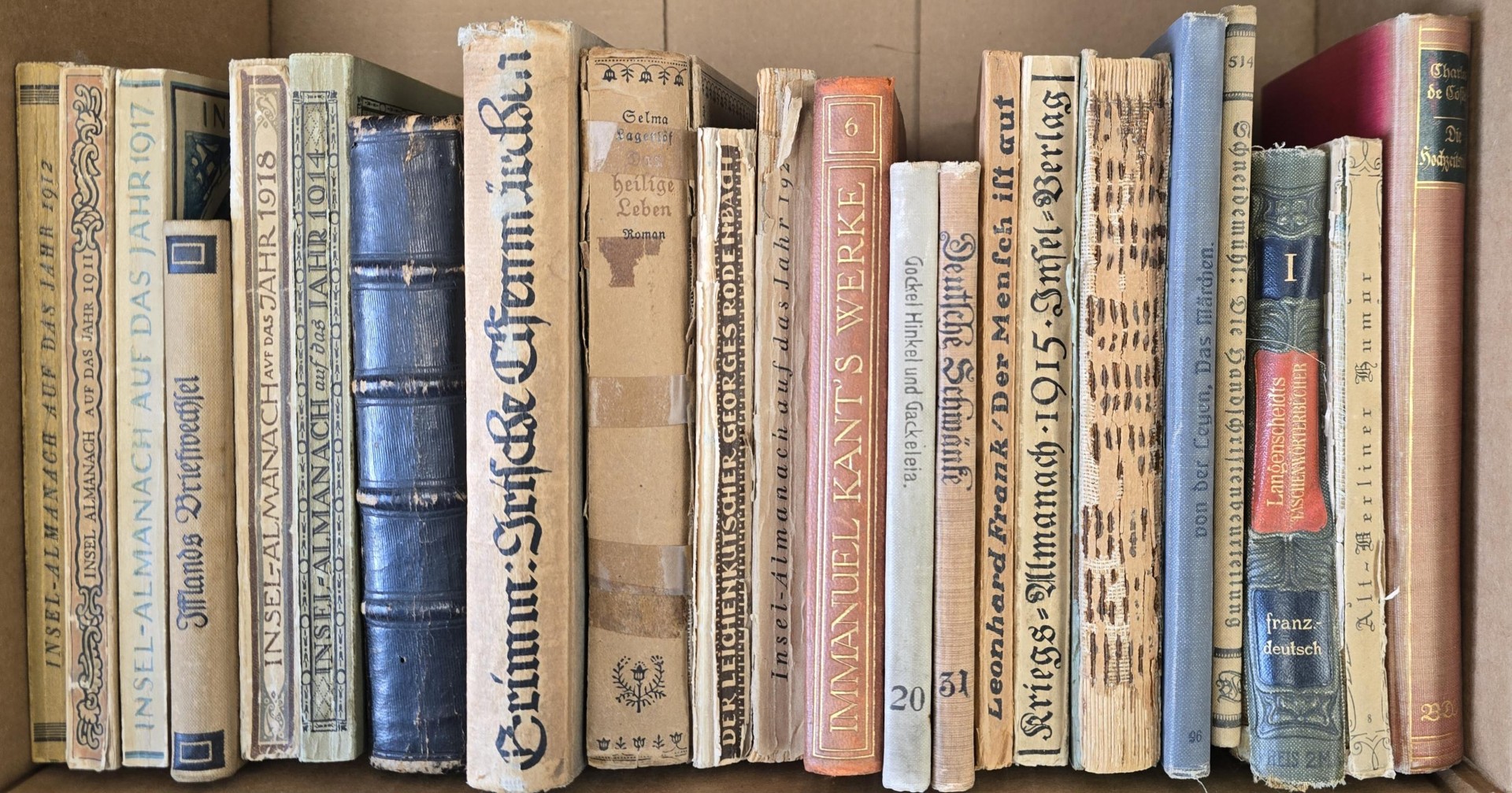 There are 22 old books in this collection; they are all in the German Language. Some are softbound, some hardcover; 2 are in leather. Some have torn spines or other damage. They are old so many are not in the greatest condition. NO FOREIGN ORDER ON THIS BUNDLE.