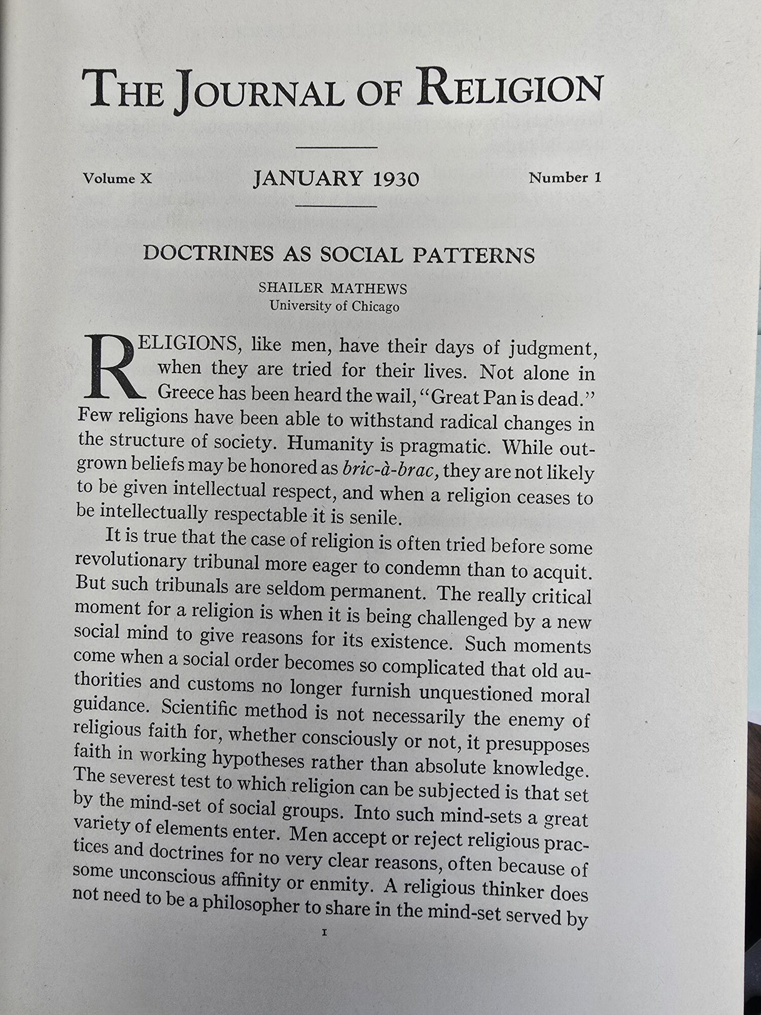 Vol. X, Number 1, January 1930; starts with an article by Shailer Mathews entitled “Doctrines as Social Patterns.”