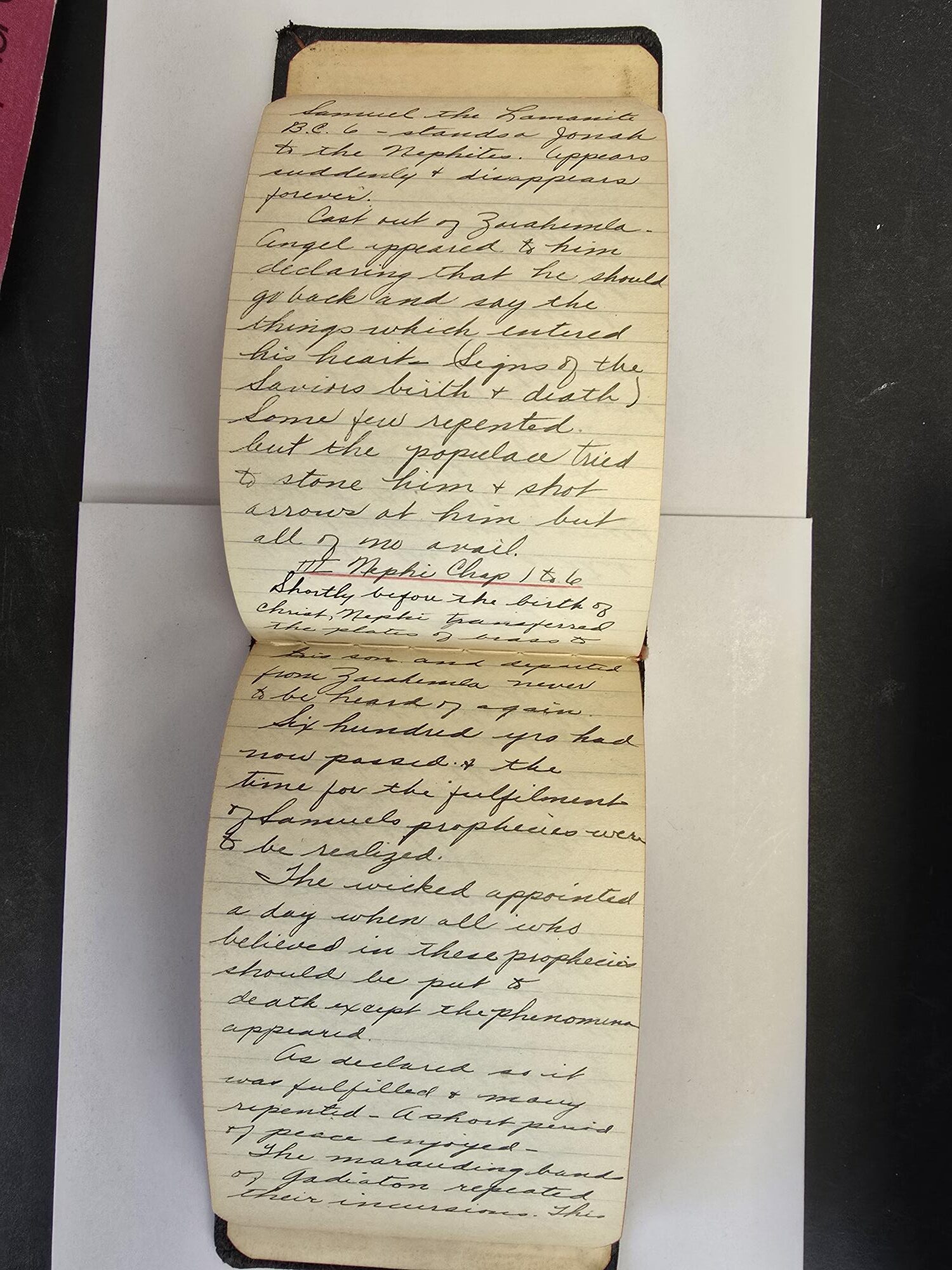 This little black notebook has no words on the cover; inside is an inked report about the Book of Mormon, mostly the book of First Nephi.