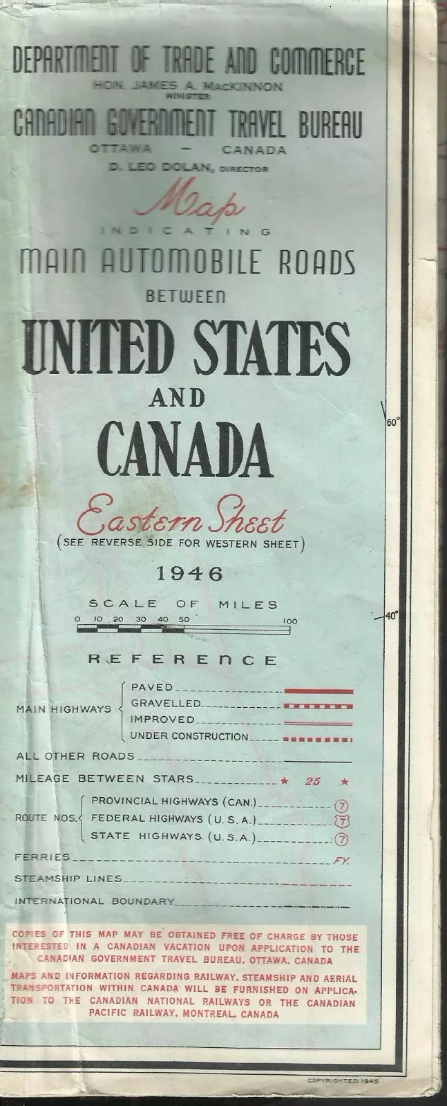 Map Indicating Main Automobile Roads Between United States and Canada – 1946