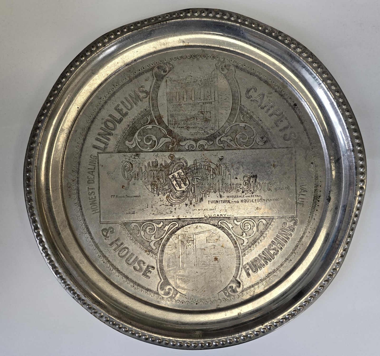 We think this plate is from a furniture store in Calgary, Canada. Click on the photo below to enlarge it.