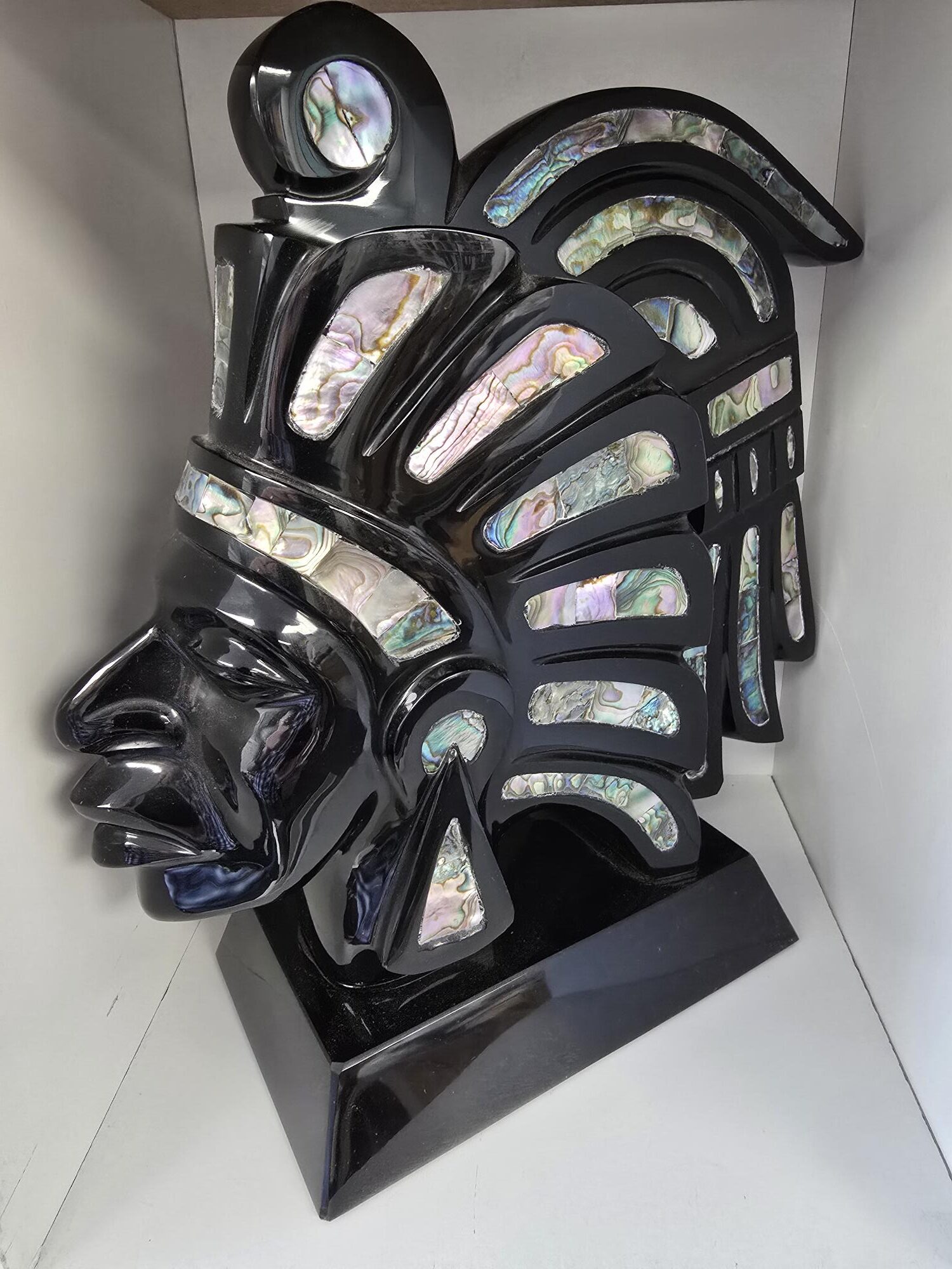Obsidian Warrior Bust with Mother-of-Pearl Inlay / Over Twelve Pounds / Beautiful! / 11″ Tall