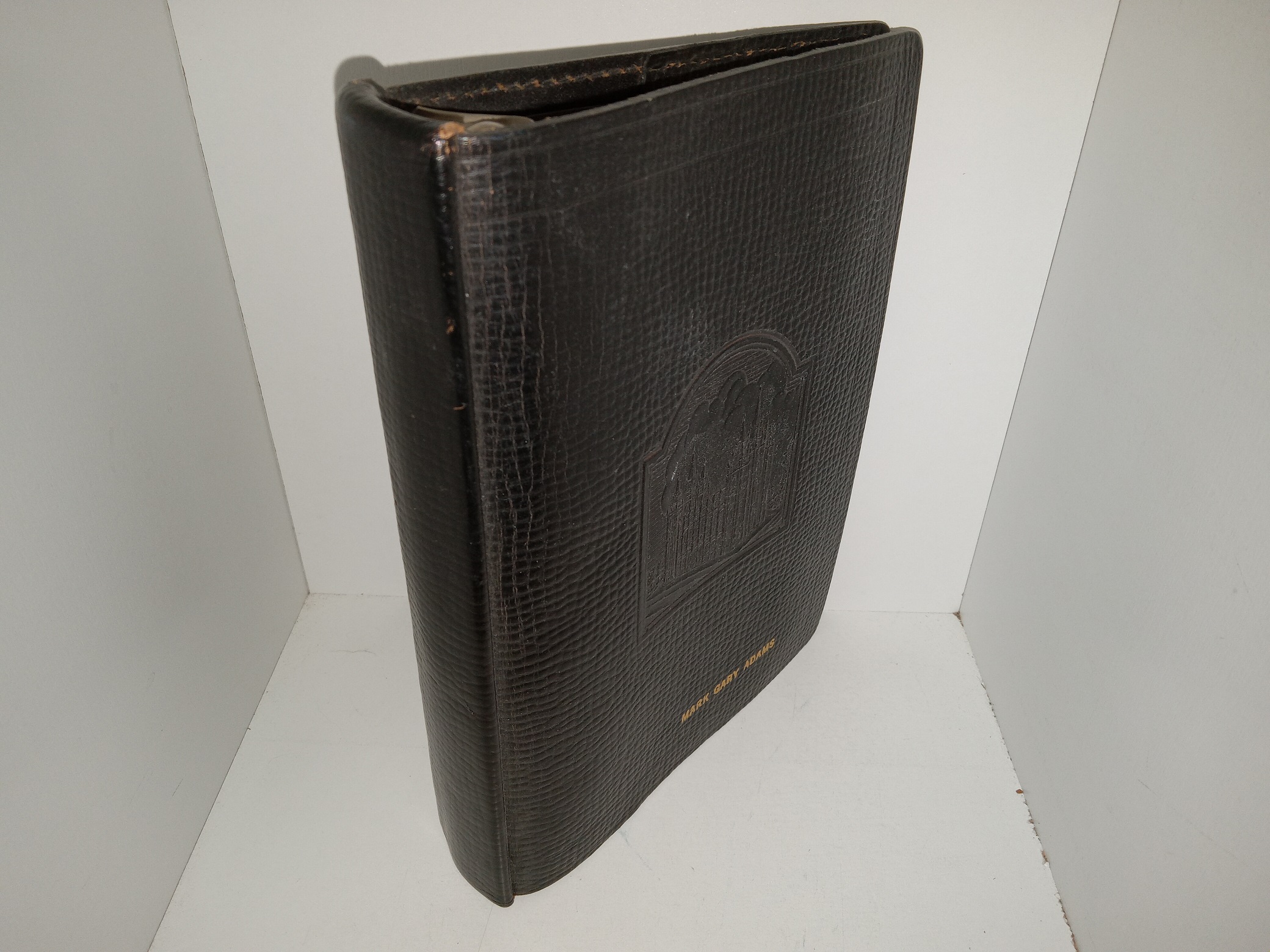Fair condition book kept within a small, black binder. The binder has the name of a previous owner engraved on the front, and some minor scuffing. The first page has writing in pencil and some eraser marks. Some pages have staple holes and dents, and others have writing in pen.