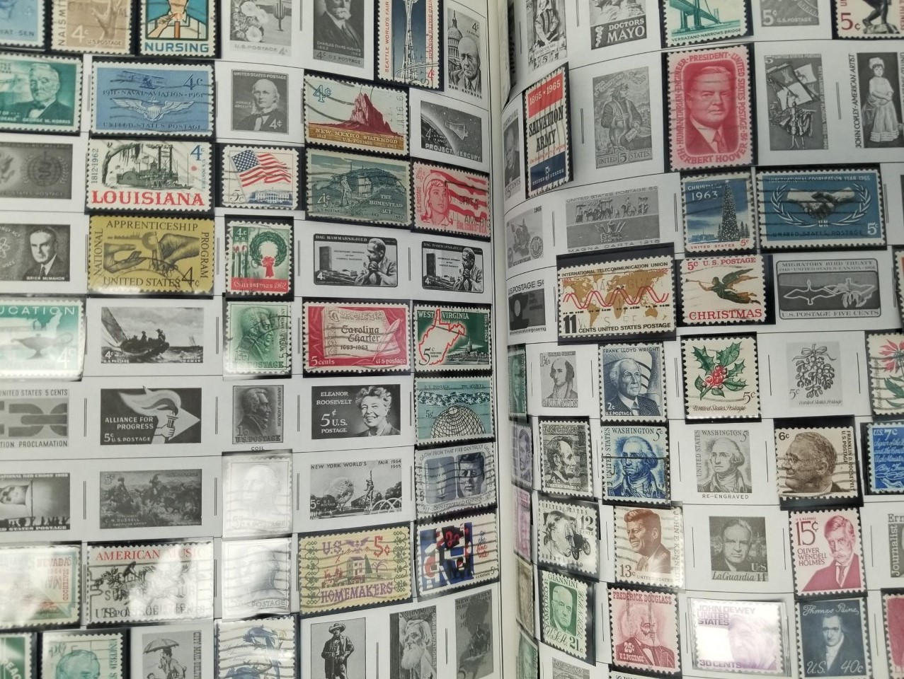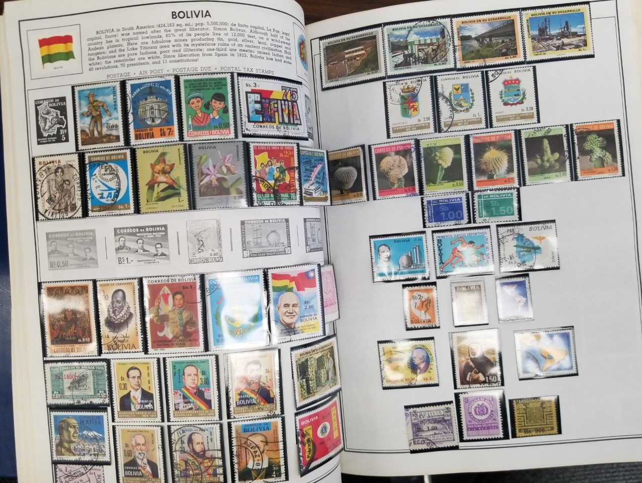 We counted 1,291 stamps in the album; most are in place inside the little plastic sheets, just a few are loose in the binding. 333 U.S. Stamps included; 85 stamps are Bolivian, some are new; other stamps throughout are also new and unused, but most are used.