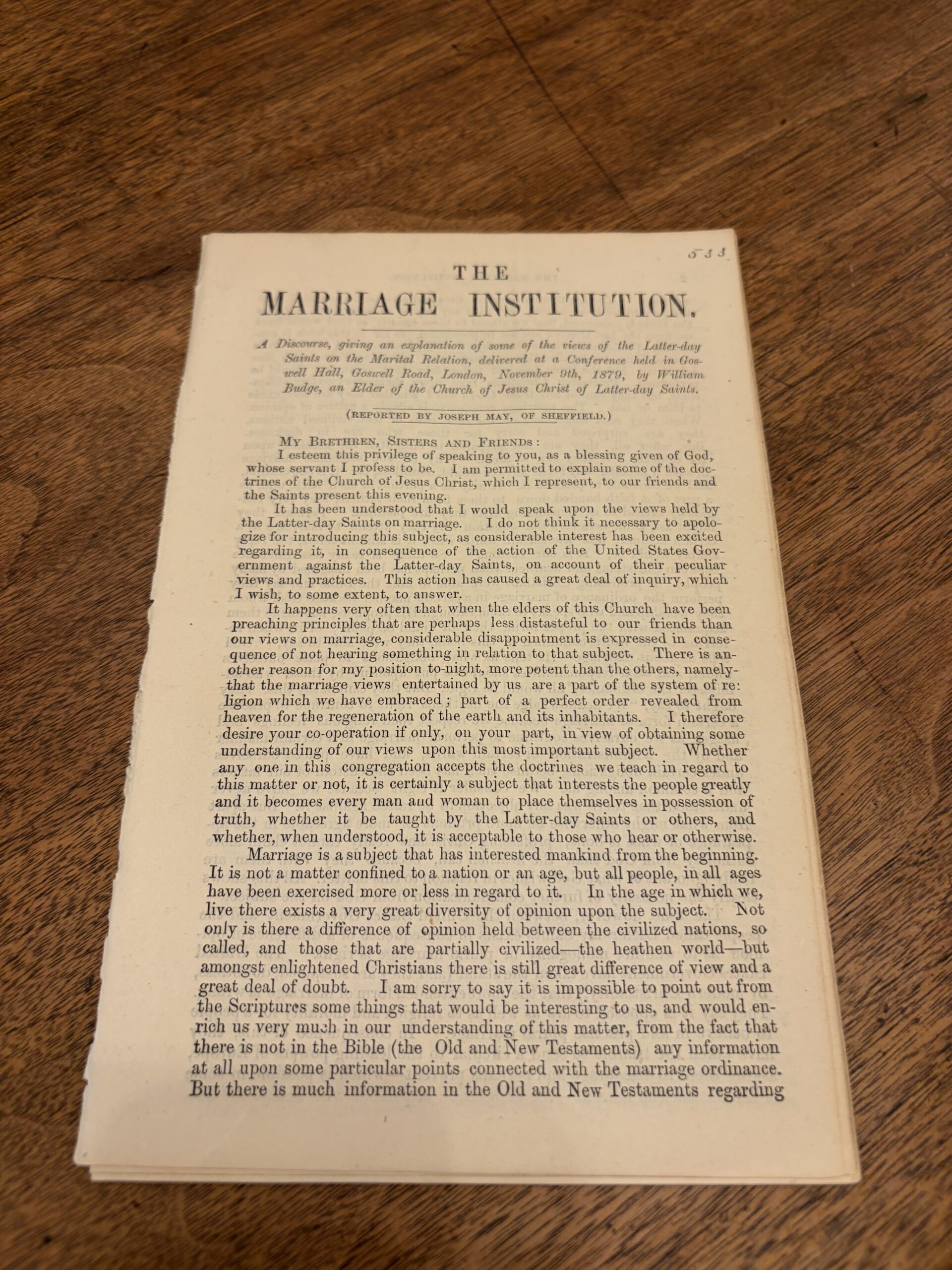 The Marriage Institution Pamphlet – A Discourse given by William Budge – November 9th, 1879