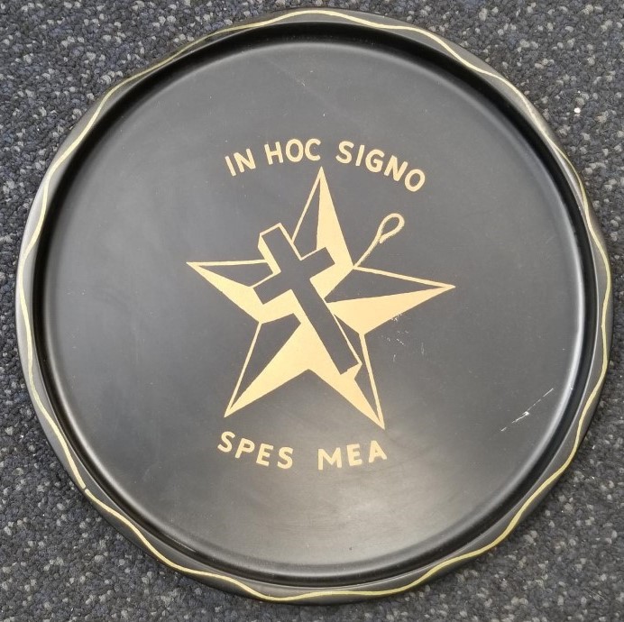 Black tin tray with IN HOC SIGNO SPES MEA on it. According to the internet it means IN THIS SIGN (THE CROSS) IS MY HOPE.