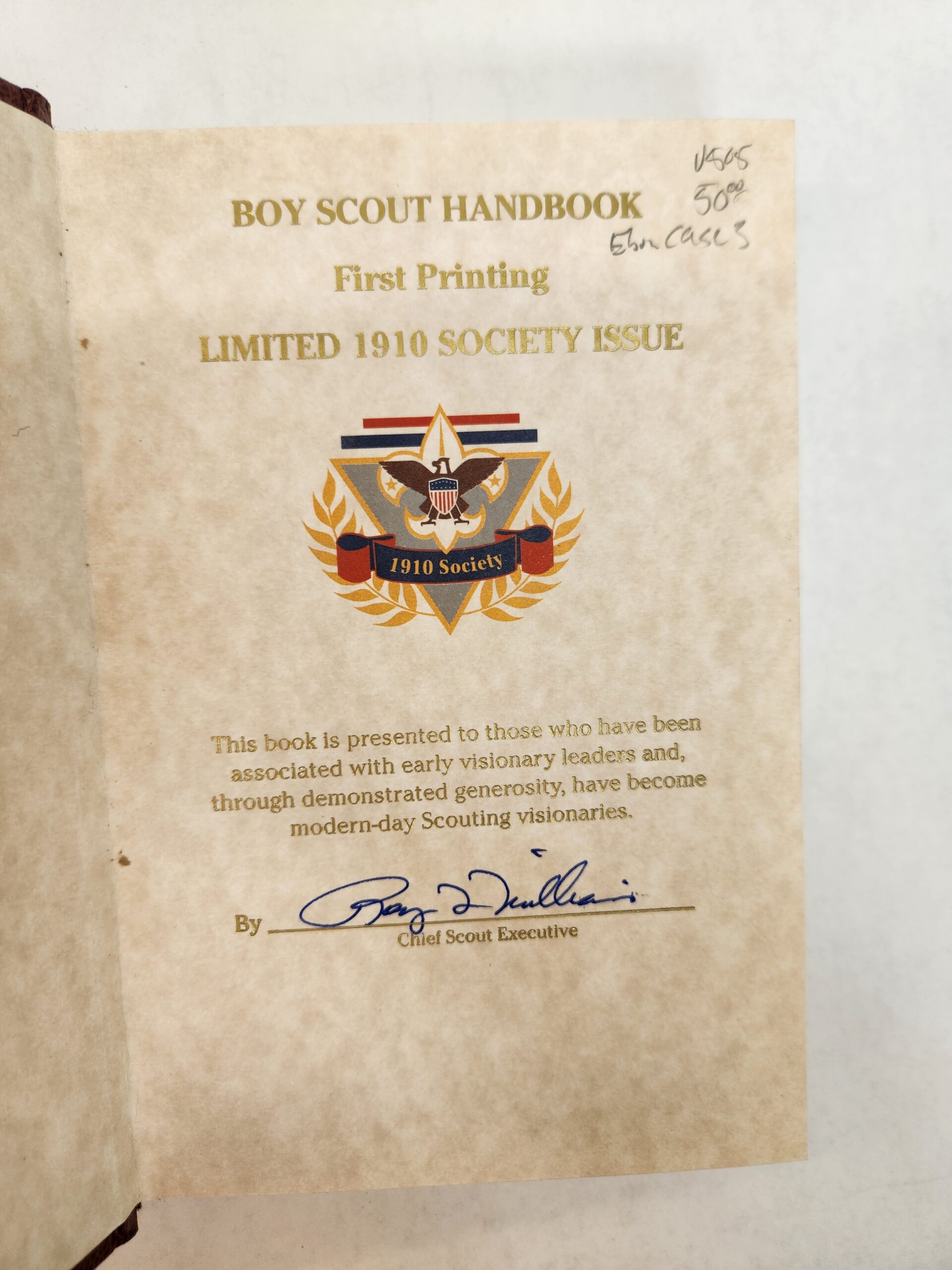 Boy Scouts of America:: Handbook for Boys (1911, Limited 1910 Society Issue, Hardcover) No marks or writing on pages. Corners and edges show minimal shelf wear. Binding is good. Cover has one small smudge mark. Small bend in back pages (see picture in gallery for example).