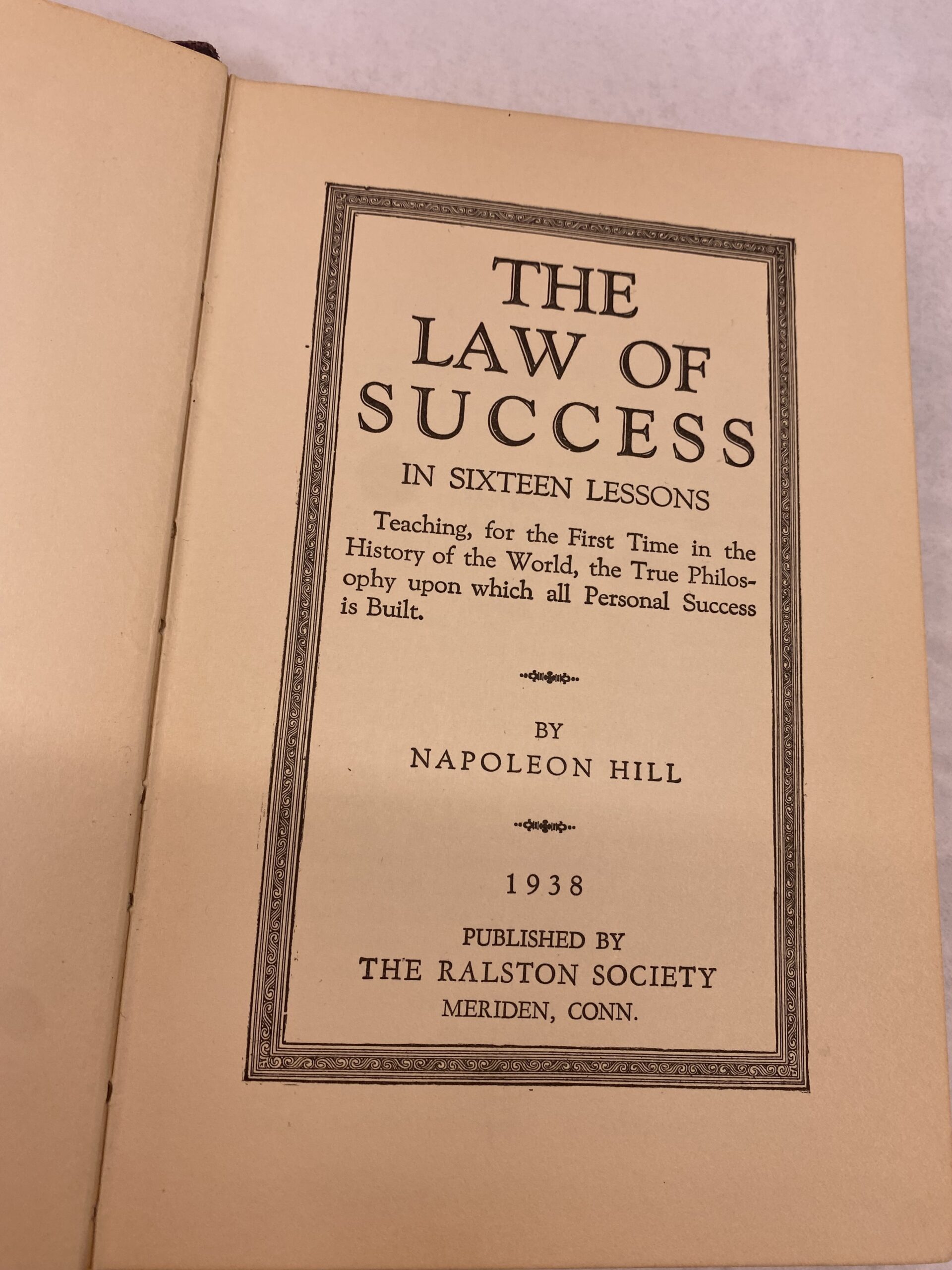 The Law of Success in Sixteen Lessons by Napoleon Hill. Leather bound, 1938 printing.