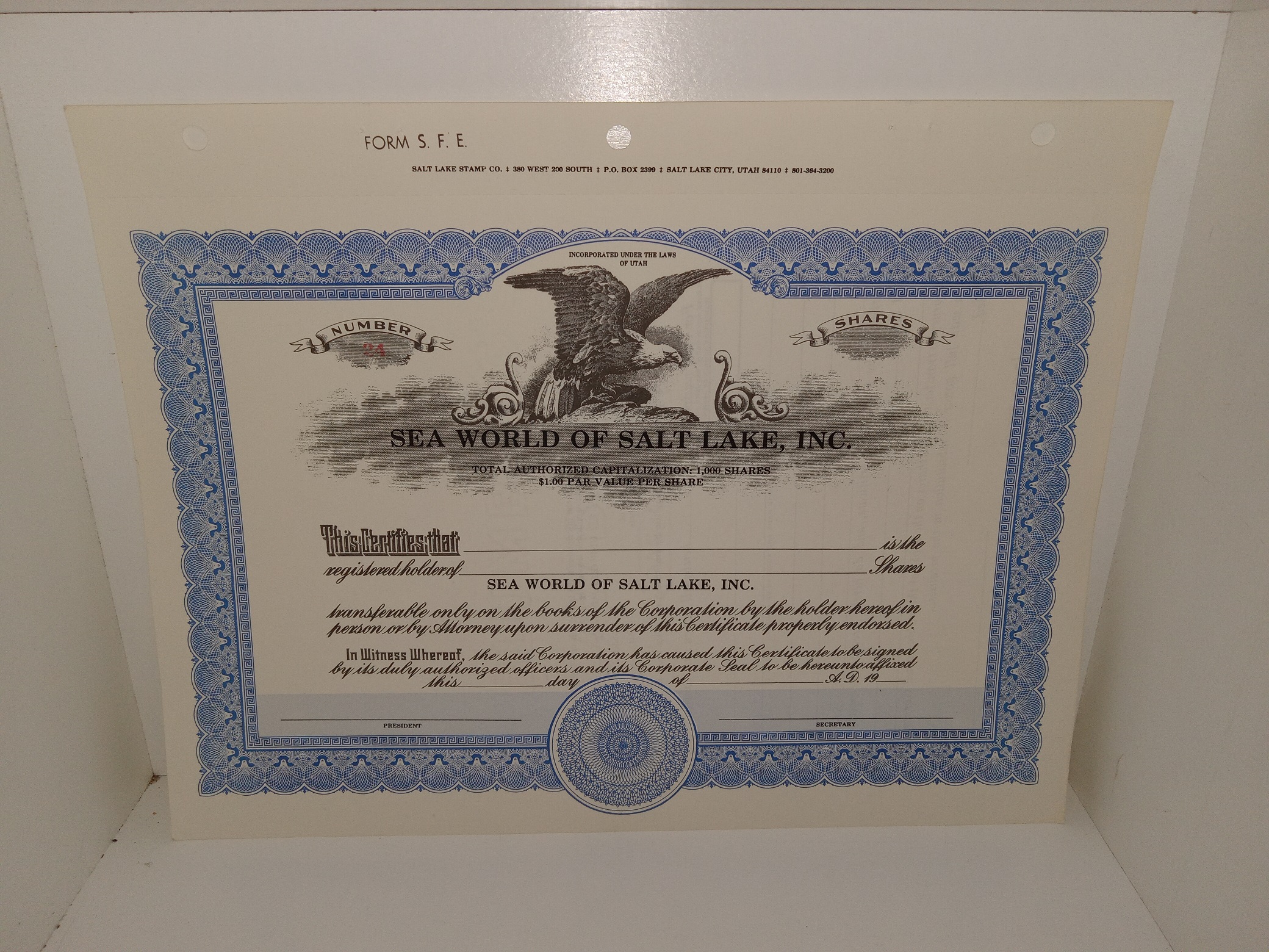 Sea World of Salt Lake, Inc. Old Stock Certificate