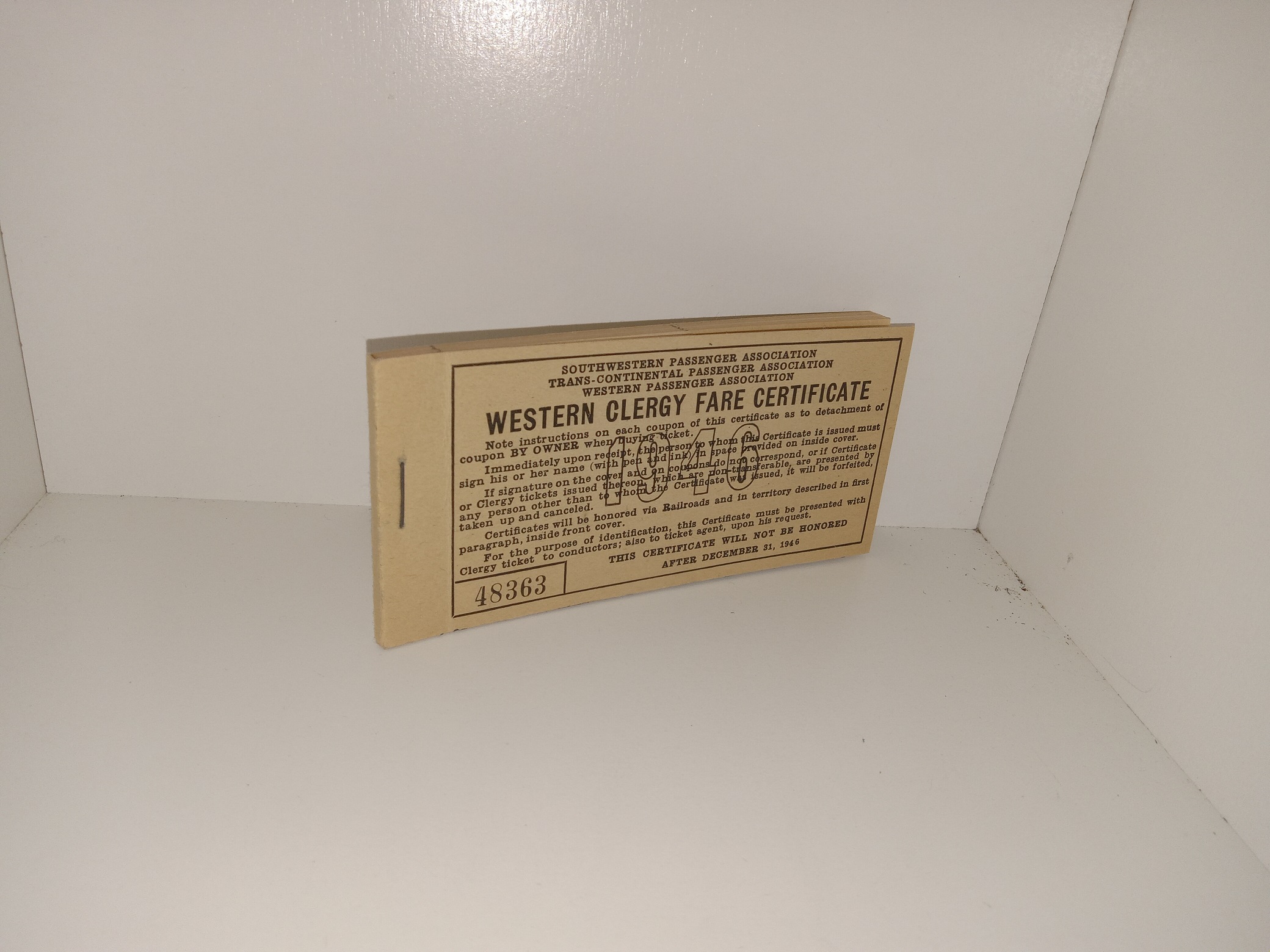 Fair condition, small, staple-bound booklet containing tickets. The cover has some minor wrinkling, and some wear at the edges. One of the tickets has been used and is missing. The back of the front inside cover has the signature of a previous owner.