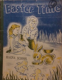 The front cover has some minor tears and wear. There is an inked on number 6 in the top right-hand corner of the front cover. There is also a stamp that reads “Magna School” on the front cover. There are some pencil and crayon markings on the title page. The last page also has some pencil markings, but otherwise, text throughout is clean and legible.