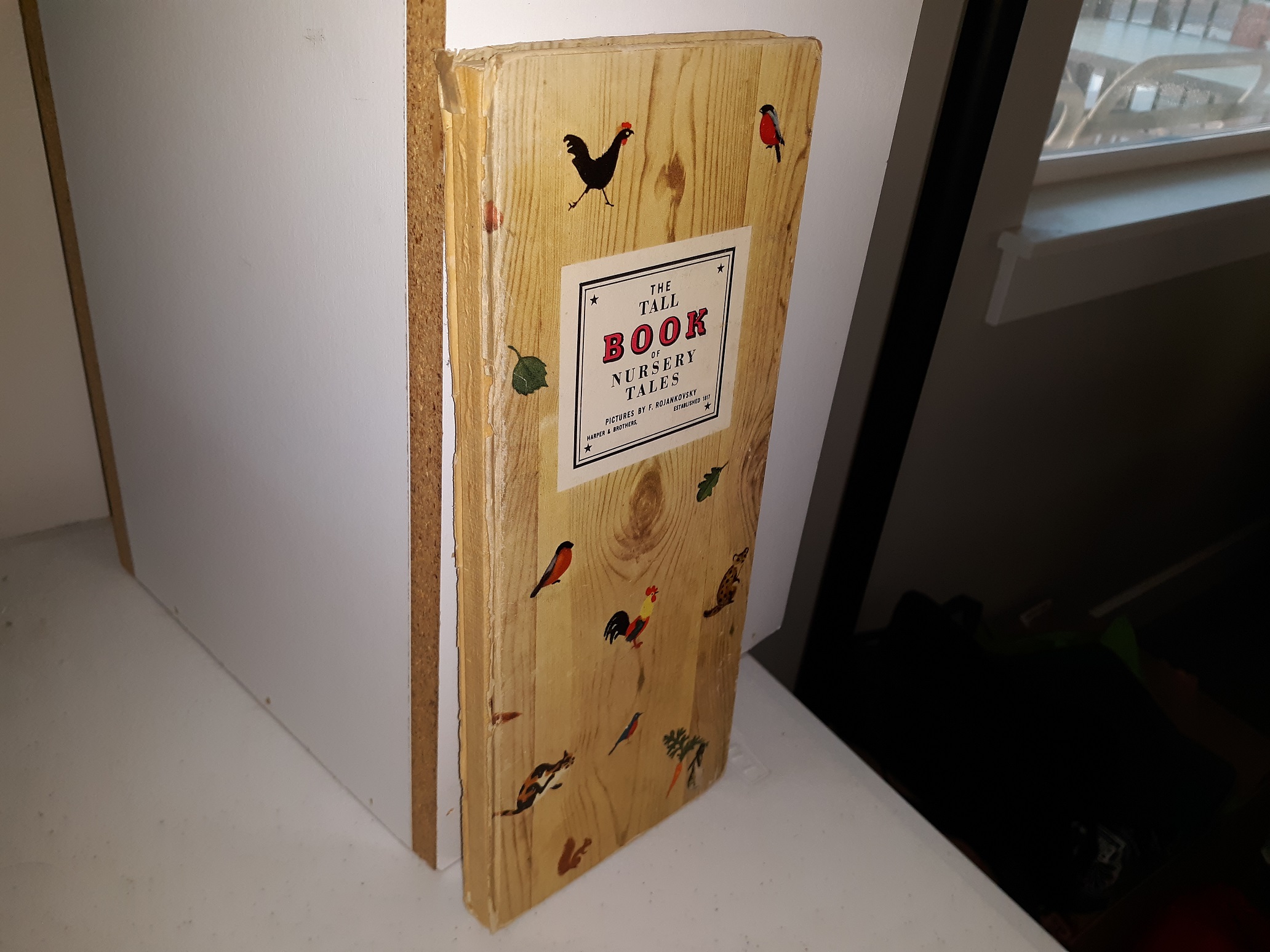 Fair condition, tall, thin, tan hardcover with no dust jacket. The spine has been torn off. The cover has scuffing, tears, and some fraying. The title page has writing in pencil. Text and illustrations throughout are clean, clear, and legible.
