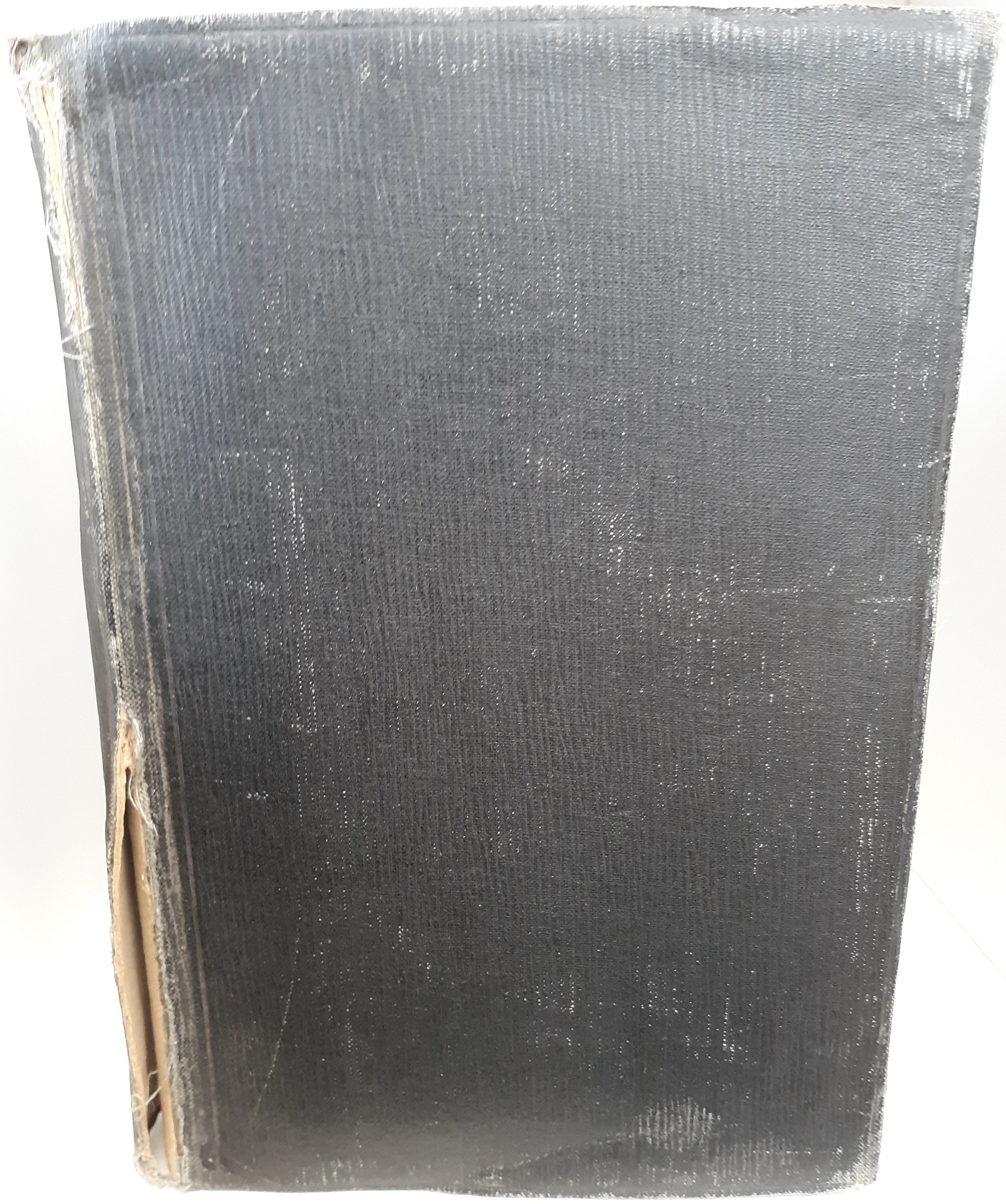 Fair condition, thick black hardcover with no dust jacket, with an additional thin, black hardcover with no dust jacket that is attached to the main book. The cover has scuffs, scratches, fraying, stains, fraying at the corners and edges, and the spine has heavy tears along the edges. The flyleaf has some pencil marks, small tears, and minor stains. Text throughout is clean, clear, and legible………………………v11 OH20