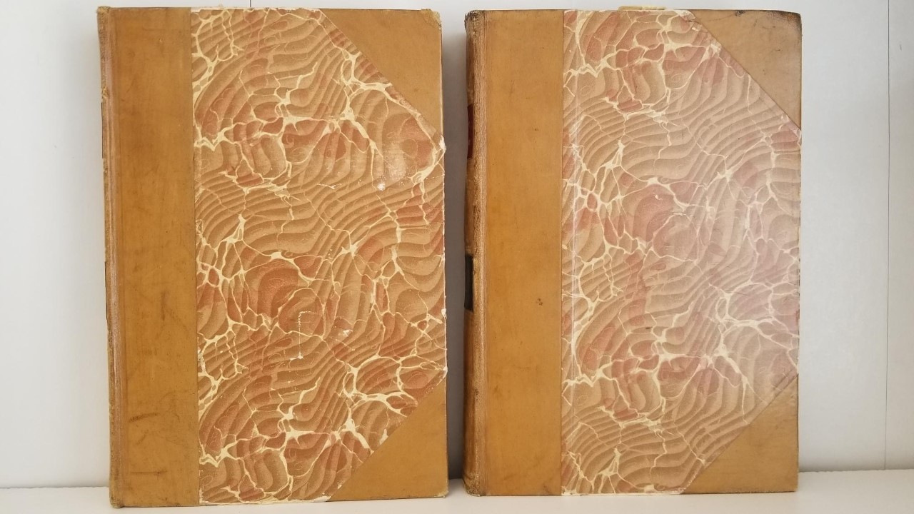 3/4 Leather Bindings, marbled boards with matching marbled end sheets and free end sheets. Some wear to binding edges, but overall a very beautiful set.