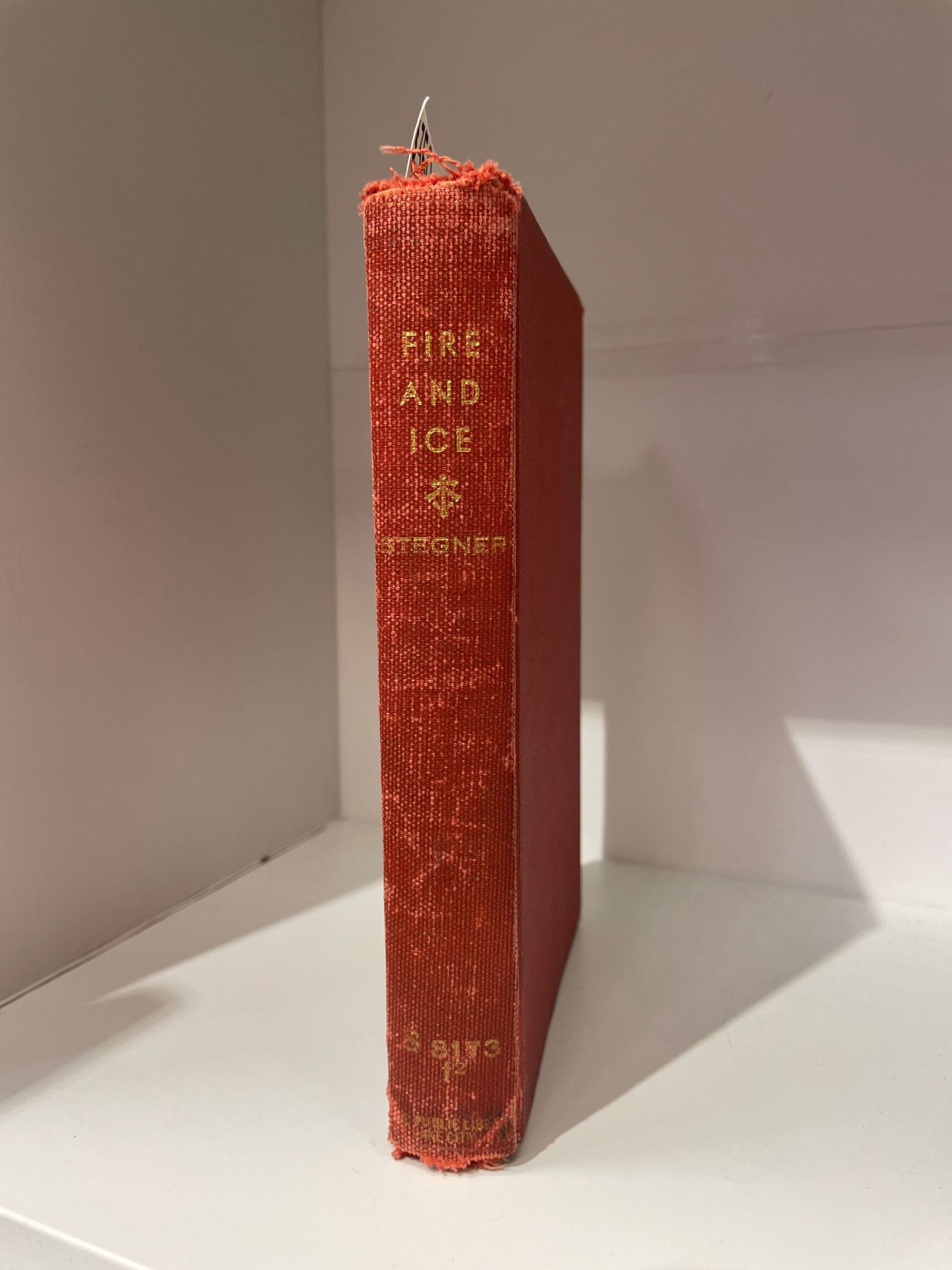 First Edition rare copy of Fire and Ice by Wallace Stegner. Some fraying on the edges, and page 9/10 is ripped slightly. The rip does not take off any text. There are also light stains on the pages.