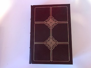 This is a red and gold leather book and is in perfect condition. The corners are slightly damaged. The outside of the pages are gold and the book has a red book mark.